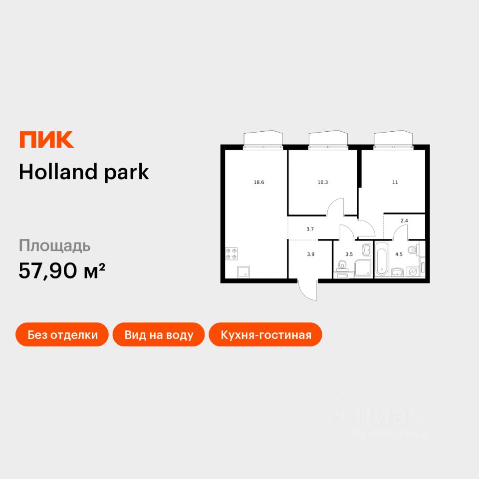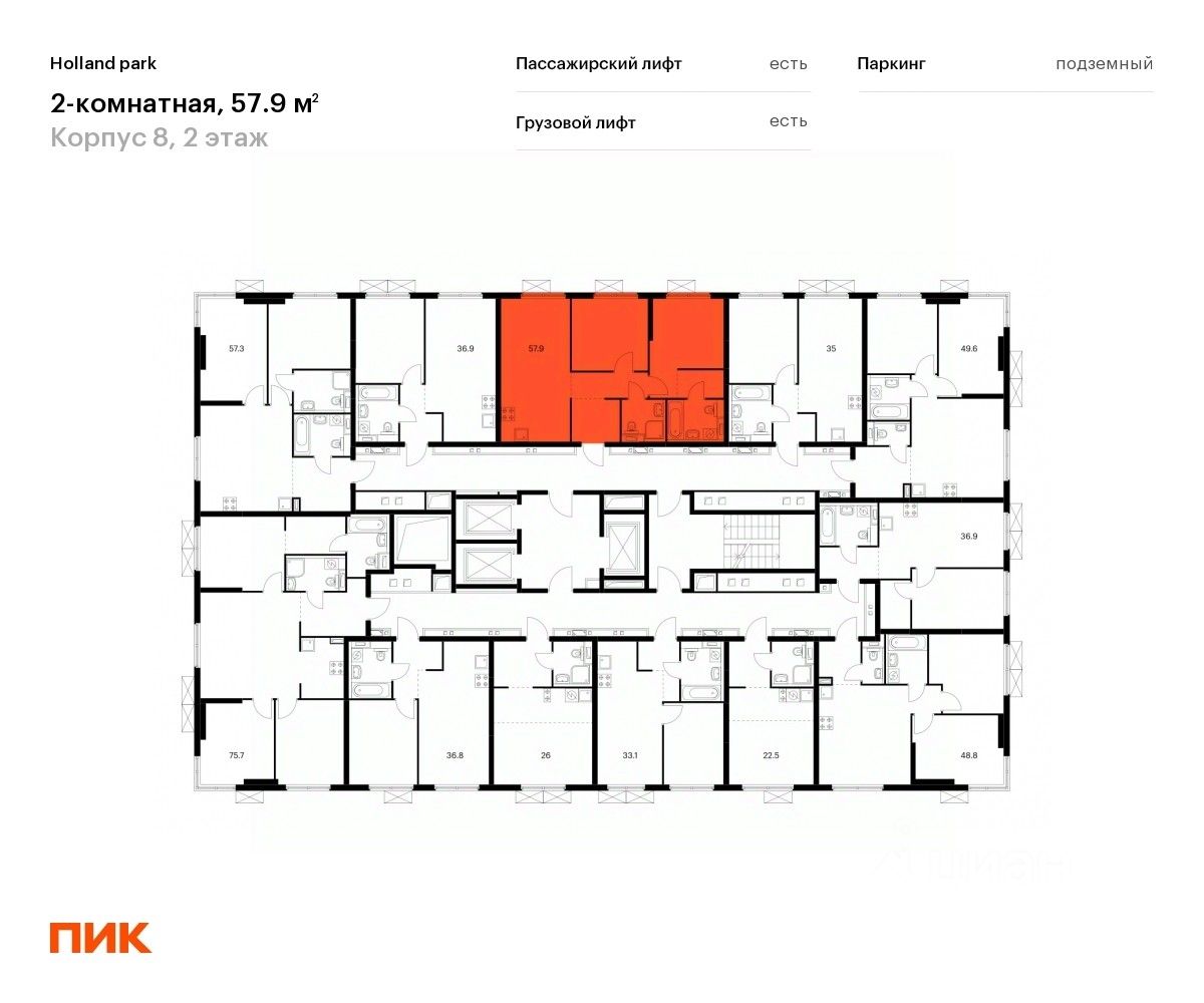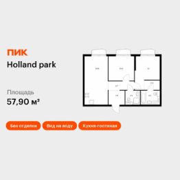 Продаётся 2-комн. квартира площадью 57,9 кв.м на 2 этаже 24 этажного дома (Корпус 8, Секция 2) проекта ПИК Holland park. Светлый просторный подъезд на уровне земли, функциональная планировка, большие окна, без отделки.