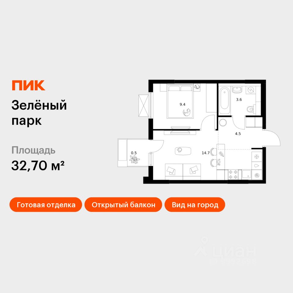 Продаётся 1-комн. квартира площадью 32,7 кв.м на 3 этаже 11 этажного дома (Корпус 6.3, Секция 3) проекта ПИК Зелёный парк. Светлый просторный подъезд на уровне земли, функциональная планировка, большие окна, c отделкой.