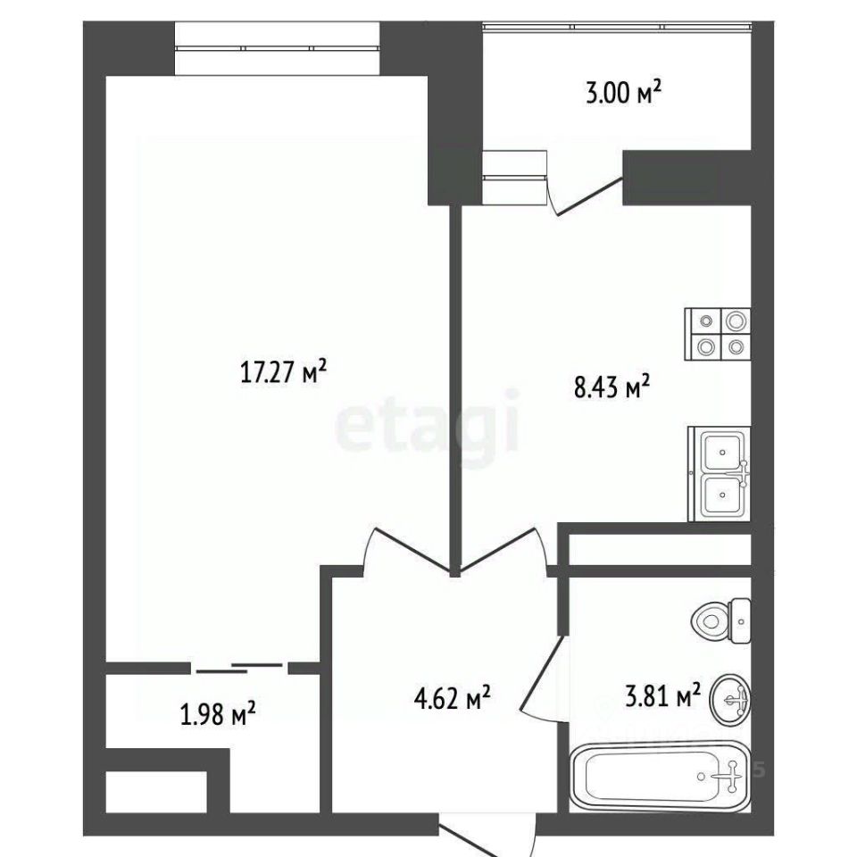 Функциональная планировка: кухня 8,5 м² , комната 17,3 м² ,гардеробная комната 2 м² , балкон 3 м² , с/у совмещённый 3,8 м² .