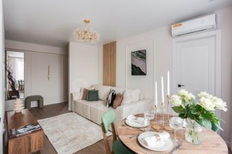 В квартире сделан качественный дизайнерский ремонт, планировка продумана до мелочей, никто после ремонта не жил. Заменены стояки холодного и горячего водоснабжения, радиаторы отопления. Всё абсолютно новое: сантехника (трубы REHAU), канализация, электрическая проводка (автоматы АВВ), установлены кондиционеры. На полу залита новая стяжка, уложен ламинат (33 класс), стены окрашены практичной моющейся краской. В квартире есть всё необходимое для комфортной жизни — уютная кухня с встроенным холодильником, посудомойкой, духовкой, вытяжкой; вместительная гостиная с обеденной зонной и зоной для отдыха с шикарным раскладным диваном; уютная спальня с собственной гардеробной; в прихожей большое зеркало и отдельная гардеробная для верхней одежды. Просторная ванная комната оборудована тёплым полом, большой ванной, душевой системой с тропическим душем, гигиеническим душем, стиральной машиной, установлены датчики протечки Neptun.