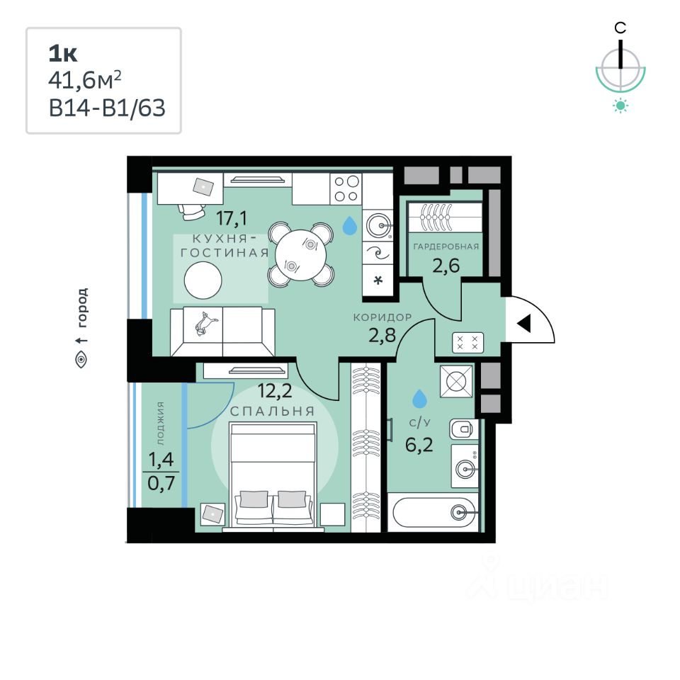 В продаже — однокомнатная квартира с чистовой отделкой, общей площадью 41,6 кв. м. Квартира расположена на восьмом этаже десятиэтажного корпуса Балансд в квартале В14 нового района СберСити, который строит Сбер.