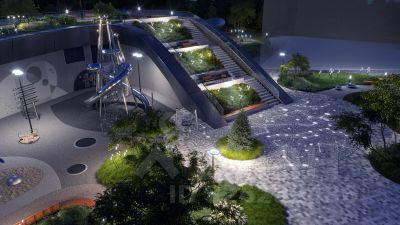 Концепция благоустройства разработана совместно с бюро UNK landscape. Высота башен приближается к 200 метрам - они словно касаются неба. Небесный простор проецируется на территорию двора с помощью подсветки, визуально увеличивая пространство и отражаясь в авторских элементах архитектуры.
