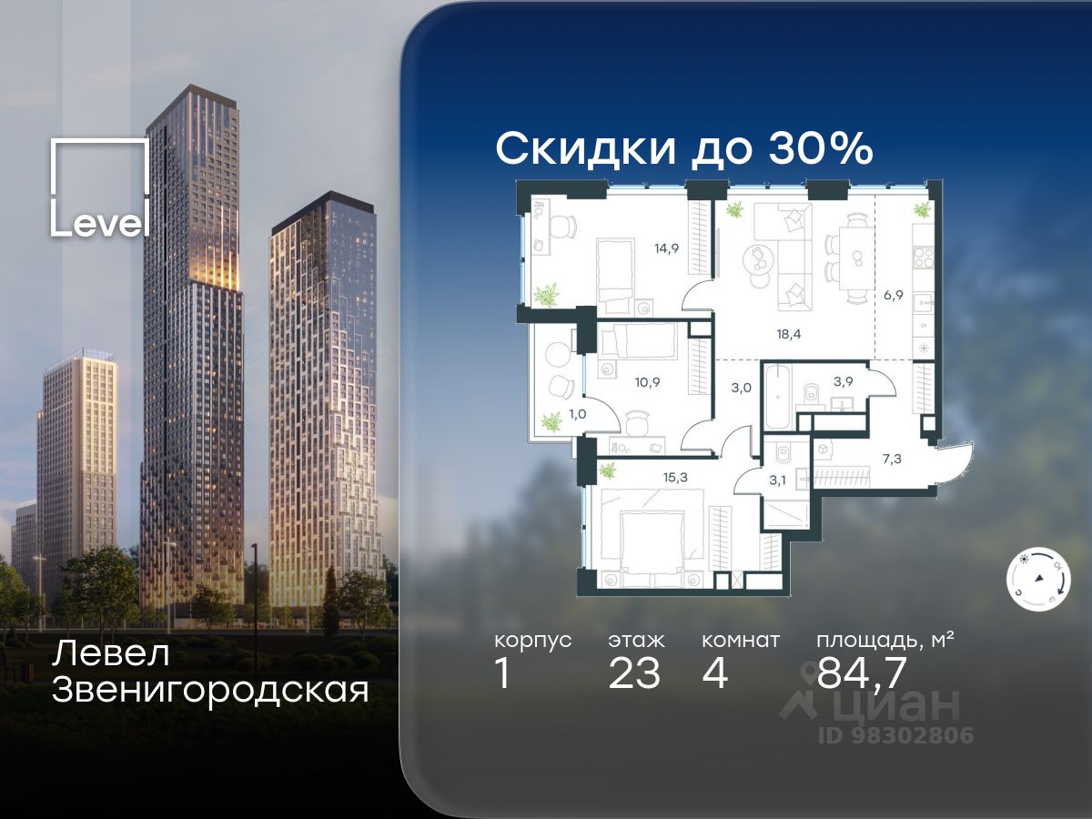 В жилом квартале продаётся 4-комнатная квартира площадью 84.70 кв.м white box. Квартира расположена на 23 этаже 48 этажного корпуса 1 в жилом комплексе комфорт класса Левел Звенигородская (компания Level Group/Левел групп).