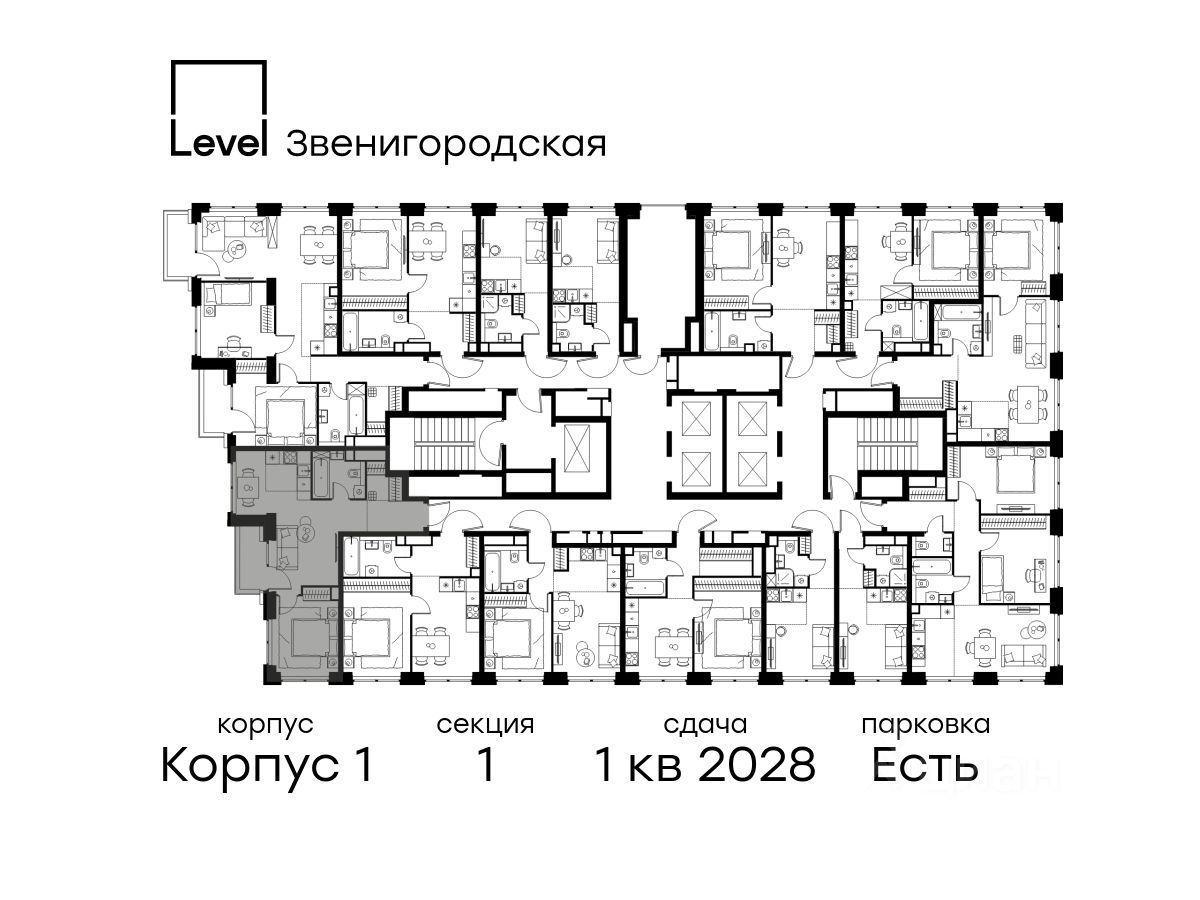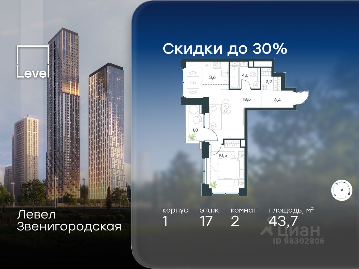 В жилом квартале продаётся 2-комнатная квартира площадью 43.70 кв.м white box. Квартира расположена на 17 этаже 48 этажного корпуса 1 в жилом комплексе комфорт класса Левел Звенигородская (компания Level Group/Левел групп).