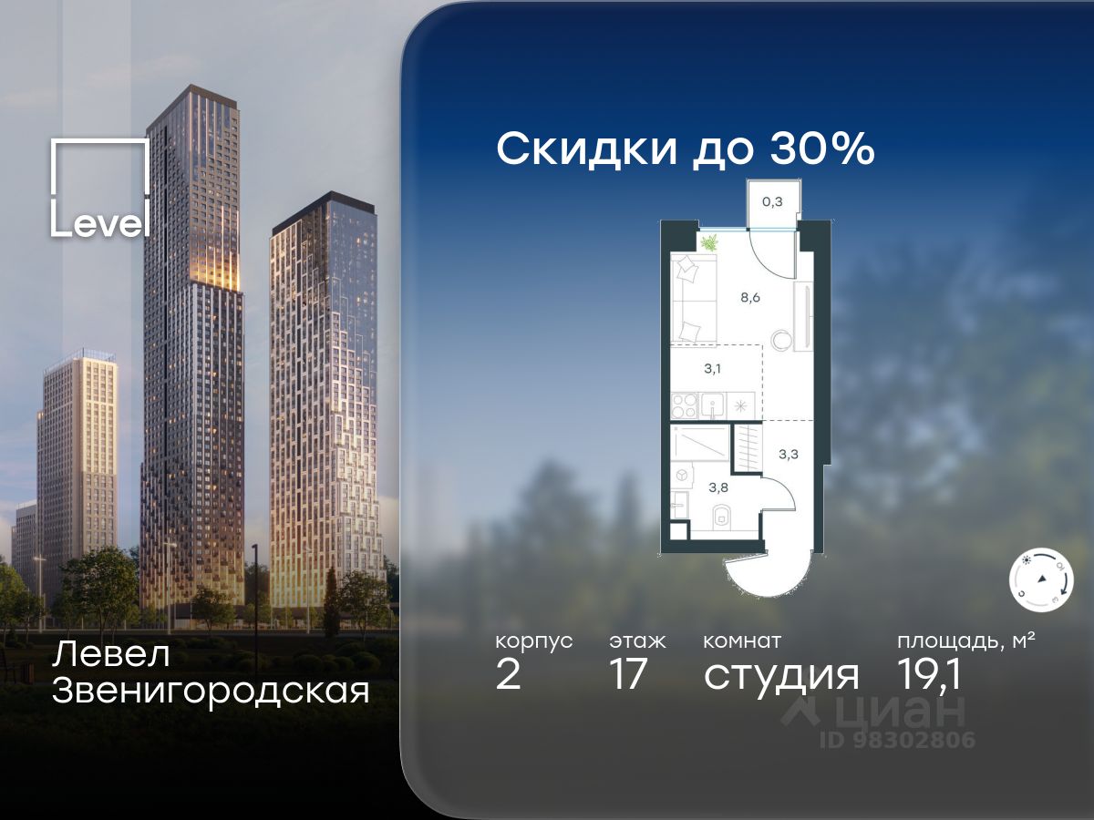 В жилом квартале продаётся студия площадью 19.10 кв.м без отделки. Квартира расположена на 17 этаже 64 этажного корпуса 2 в жилом комплексе комфорт класса Левел Звенигородская (компания Level Group/Левел групп).