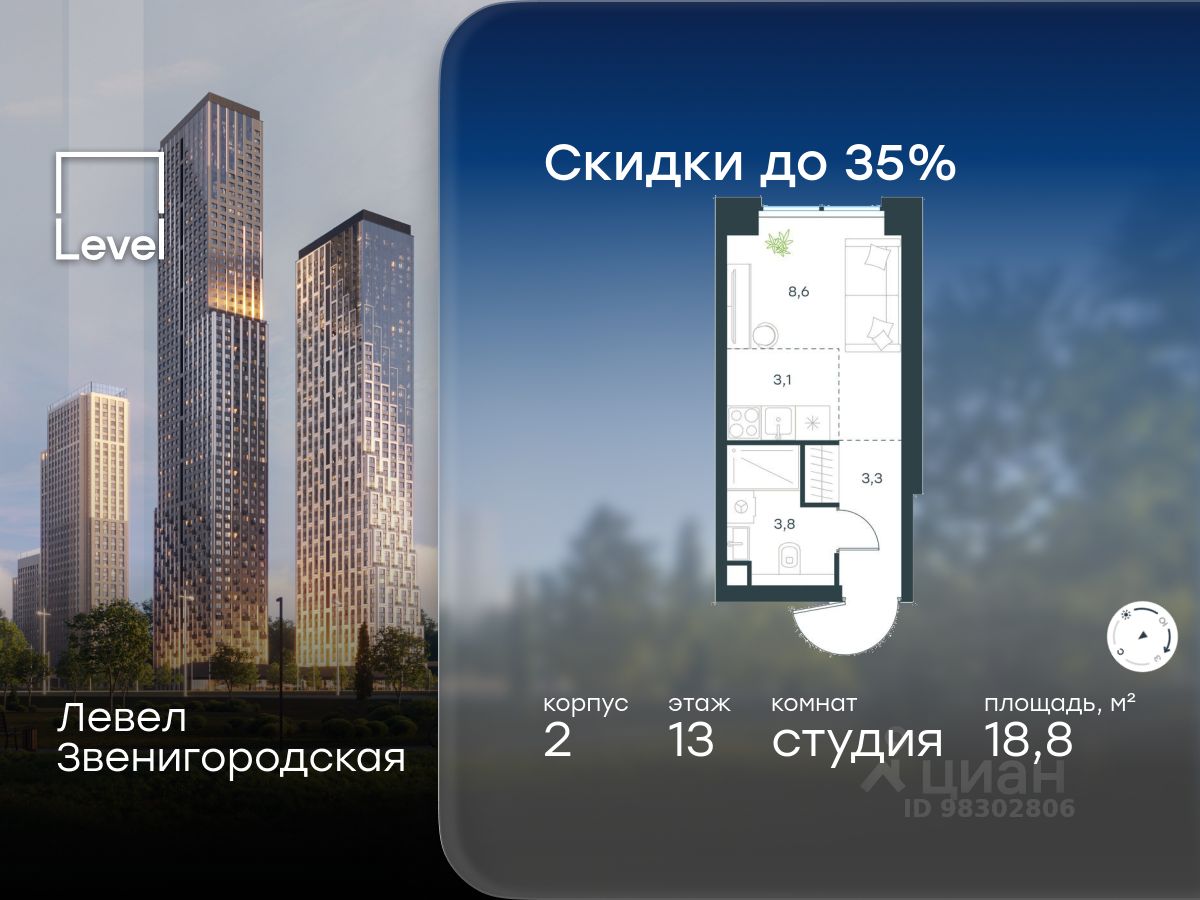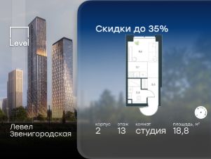 В жилом квартале продаётся студия площадью 18.80 кв.м без отделки. Квартира расположена на 13 этаже 64 этажного корпуса 2 в жилом комплексе комфорт класса Левел Звенигородская (компания Level Group/Левел групп).