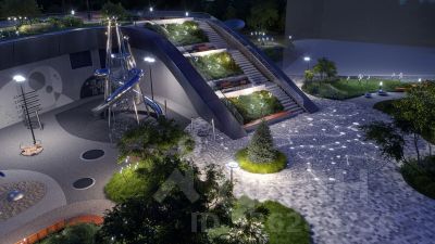 Концепция благоустройства разработана совместно с бюро UNK landscape. Высота башен приближается к 200 метрам - они словно касаются неба. Небесный простор проецируется на территорию двора с помощью подсветки, визуально увеличивая пространство и отражаясь в авторских элементах архитектуры.