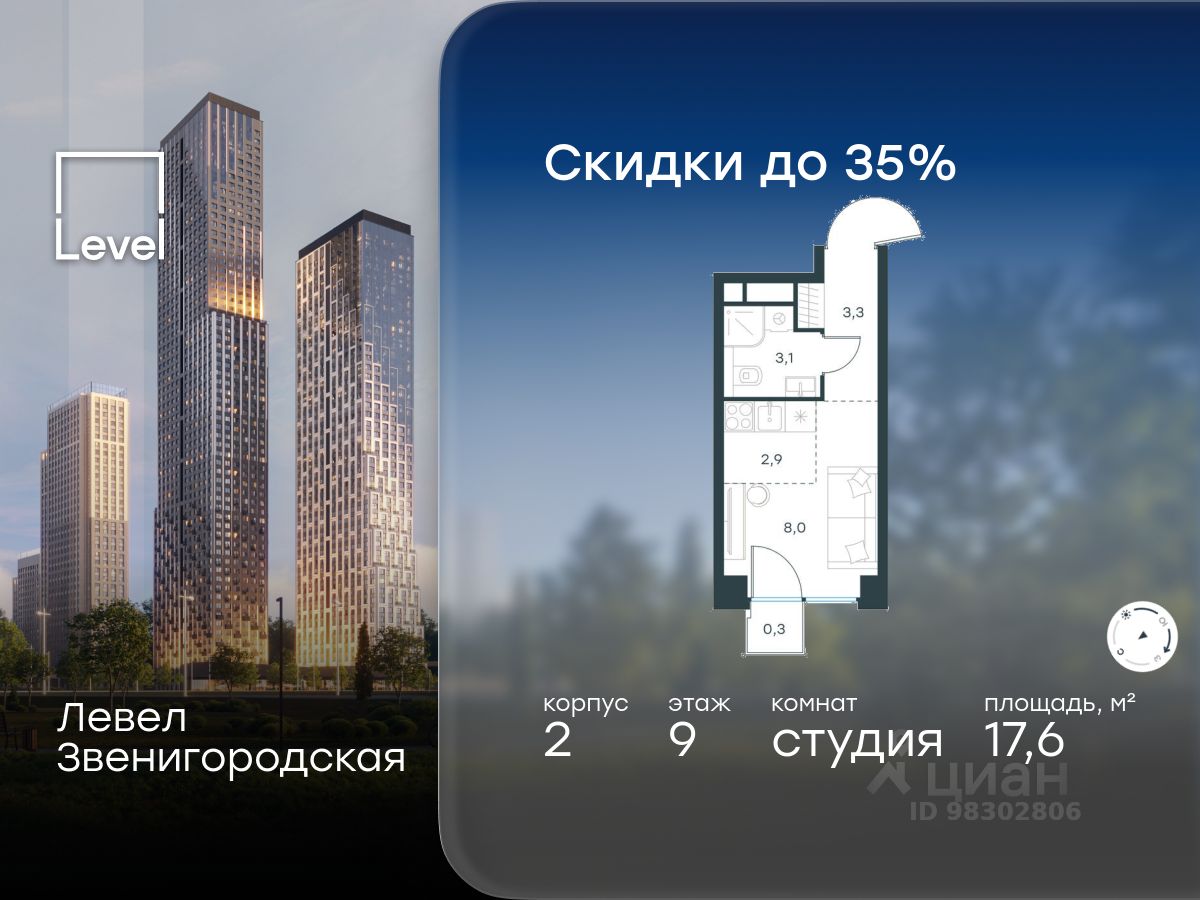 В жилом квартале продаётся студия площадью 17.60 кв.м без отделки. Квартира расположена на 9 этаже 64 этажного корпуса 2 в жилом комплексе комфорт класса Левел Звенигородская (компания Level Group/Левел групп).