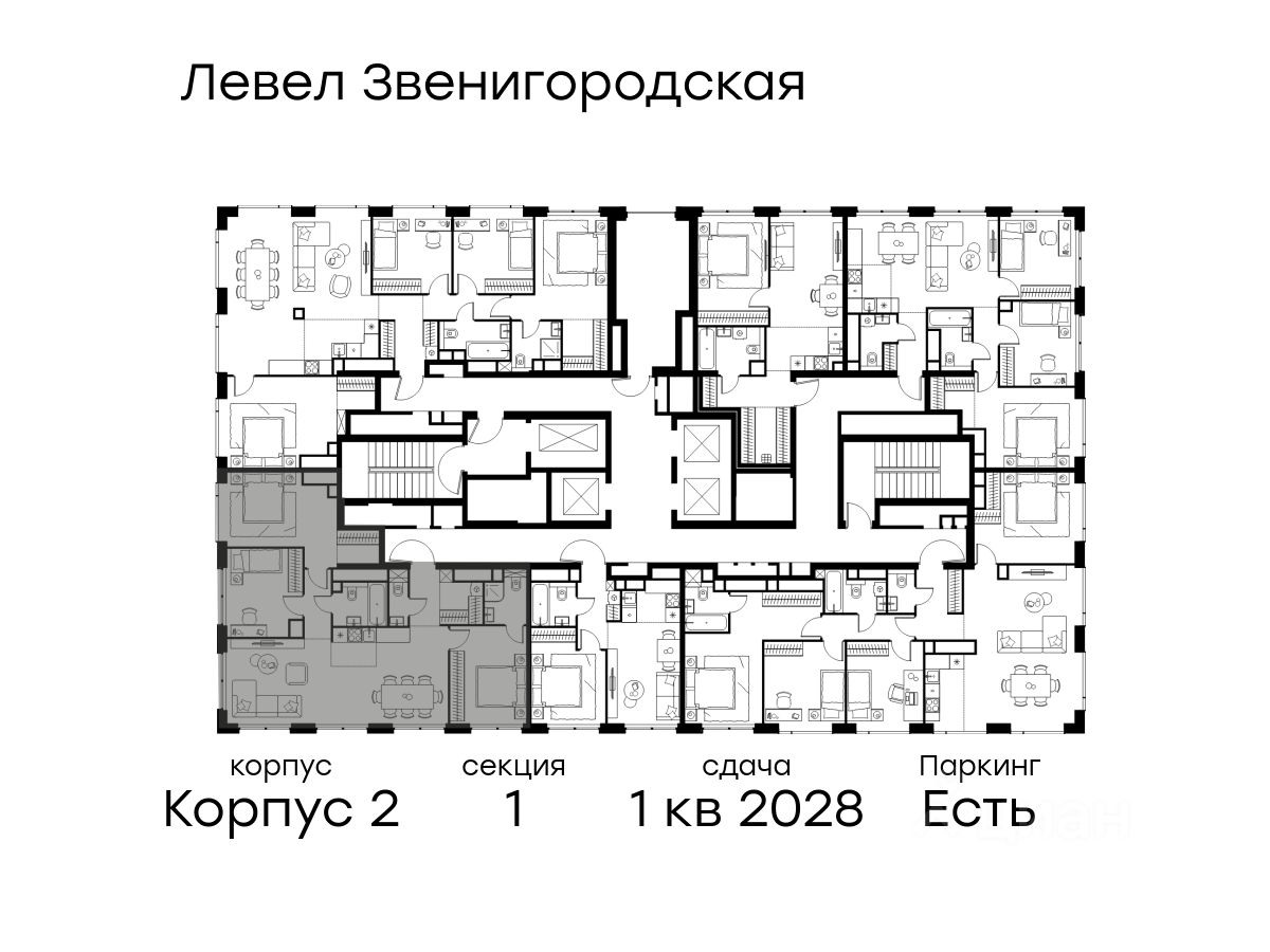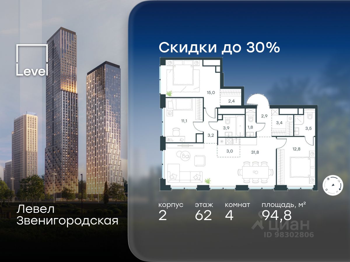 В жилом квартале продаётся 4-комнатная квартира площадью 94.80 кв.м без отделки. Квартира расположена на 62 этаже 64 этажного корпуса 2 в жилом комплексе комфорт класса Левел Звенигородская (компания Level Group/Левел групп).