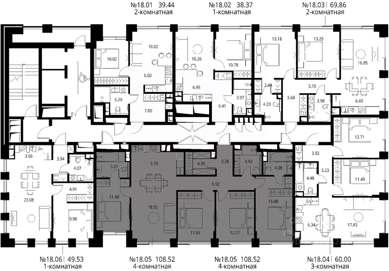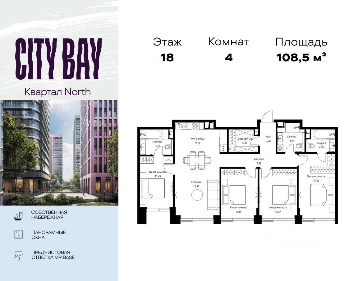 Продаётся 4-комнатная квартира общей площадью 108.52 м² с предчистовой отделкой в ЖК City Вау, квартале North, на 18-м этаже 21 этажного дома.