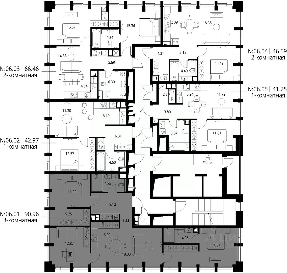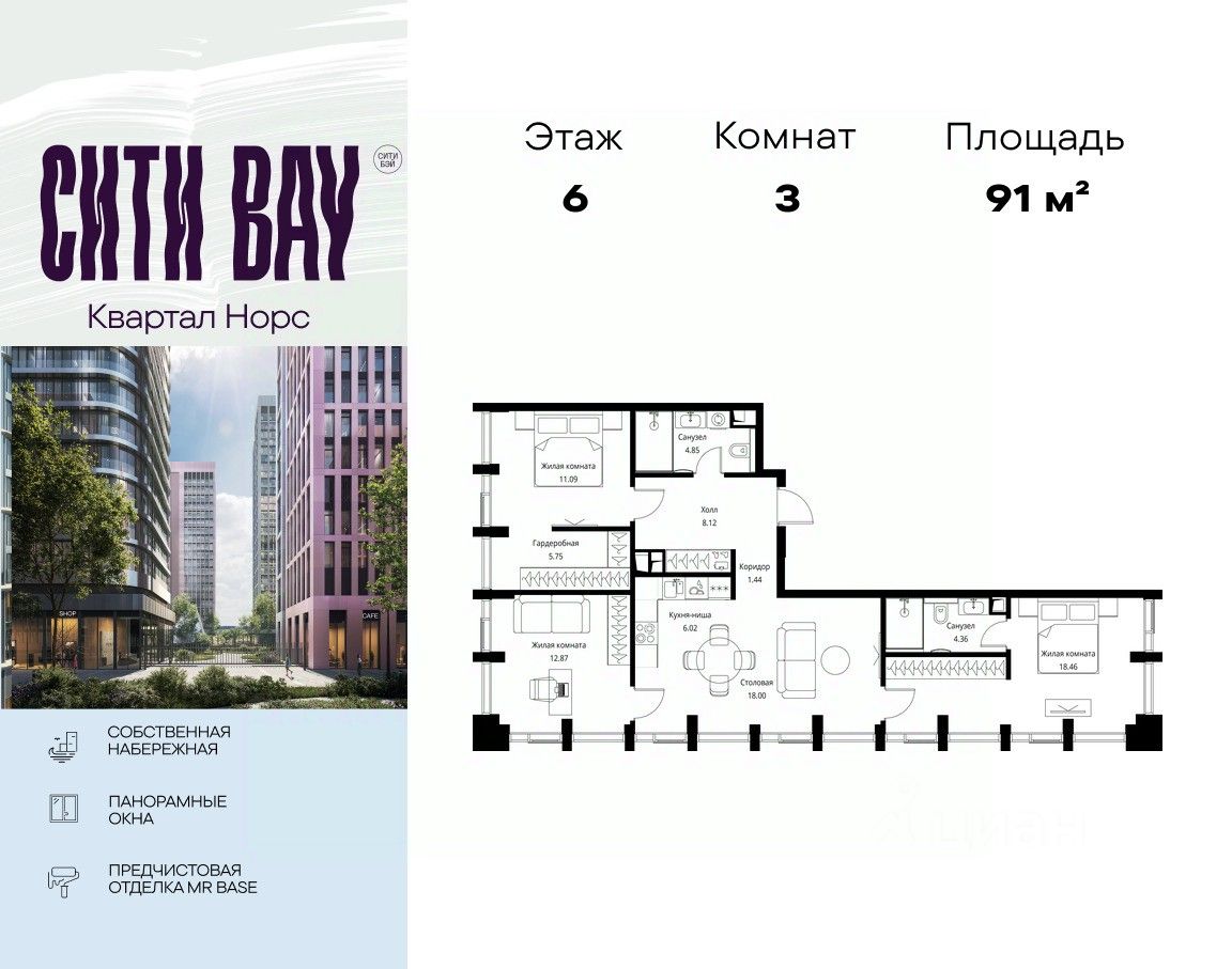 Продаётся 3-комнатная квартира общей площадью 90.96 м² с предчистовой отделкой в ЖК Сити Бэй, квартале Норс, на 6-м этаже 19 этажного дома.