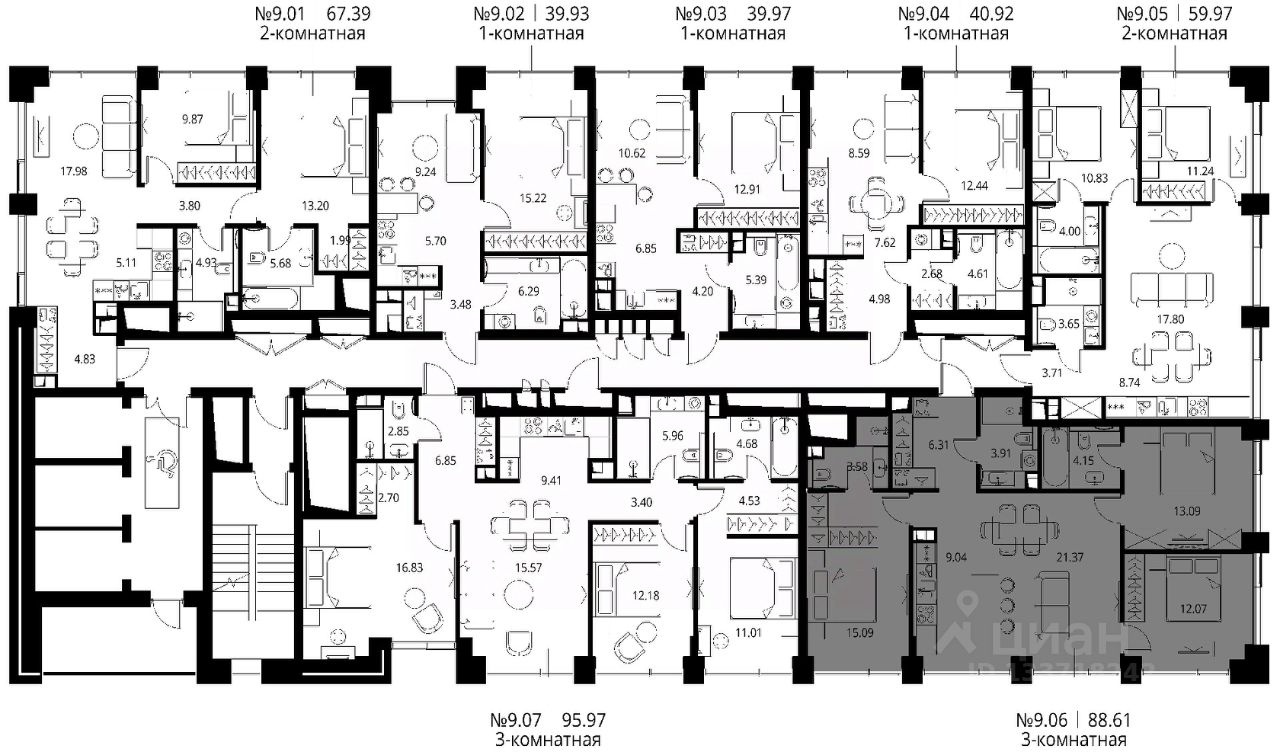 Продаётся 3-комнатная квартира общей площадью 88.61 м² с предчистовой отделкой в ЖК Сити Бэй, квартале Норс, на 9-м этаже 27 этажного дома.