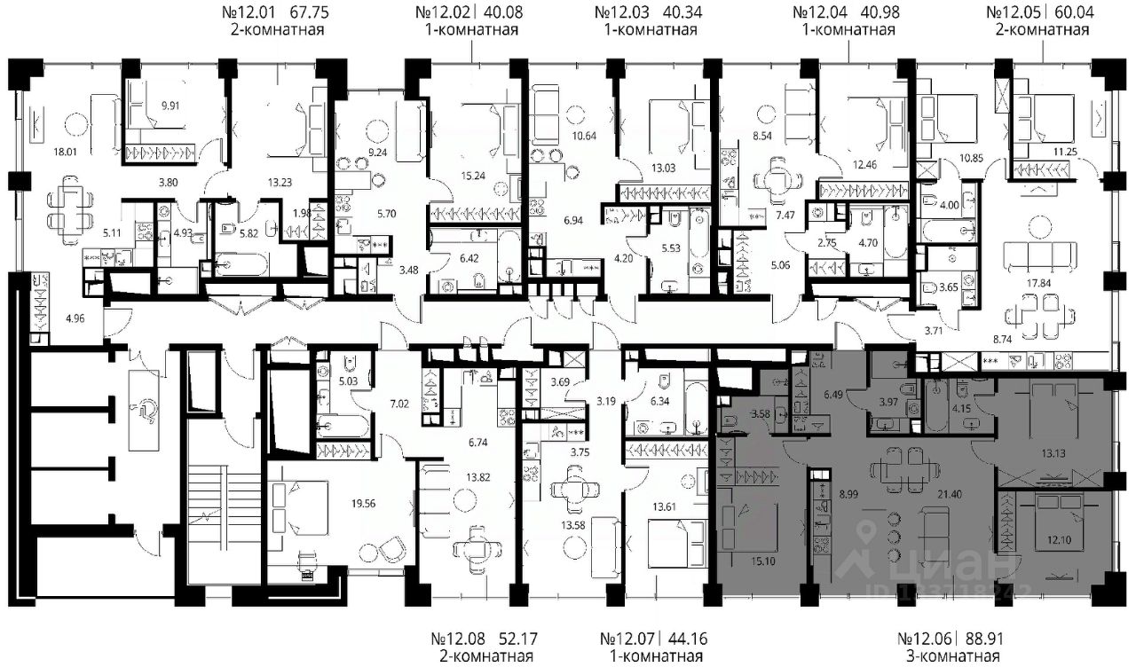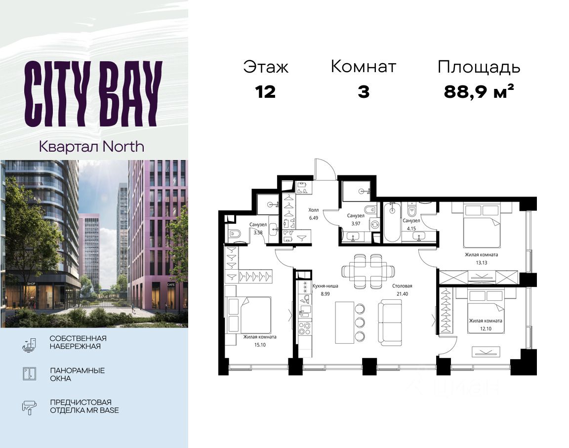 Продаётся 3-комнатная квартира общей площадью 88.91 м² с предчистовой отделкой в ЖК City Вау, квартале North, на 12-м этаже 27 этажного дома.