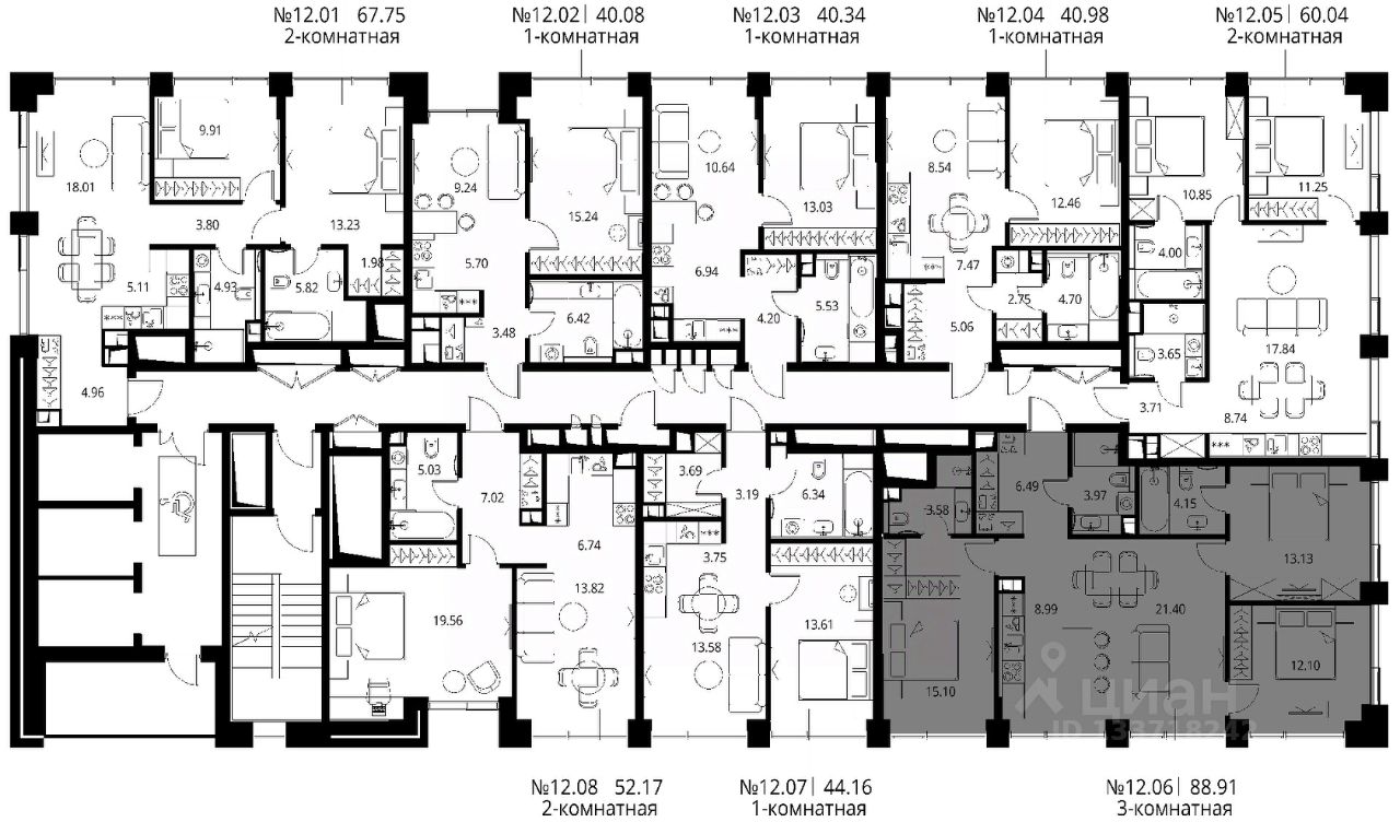 Продаётся 3-комнатная квартира общей площадью 88.91 м² с предчистовой отделкой в ЖК Сити Бэй, квартале Норс, на 12-м этаже 27 этажного дома.