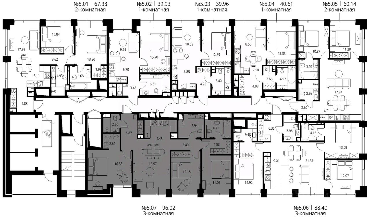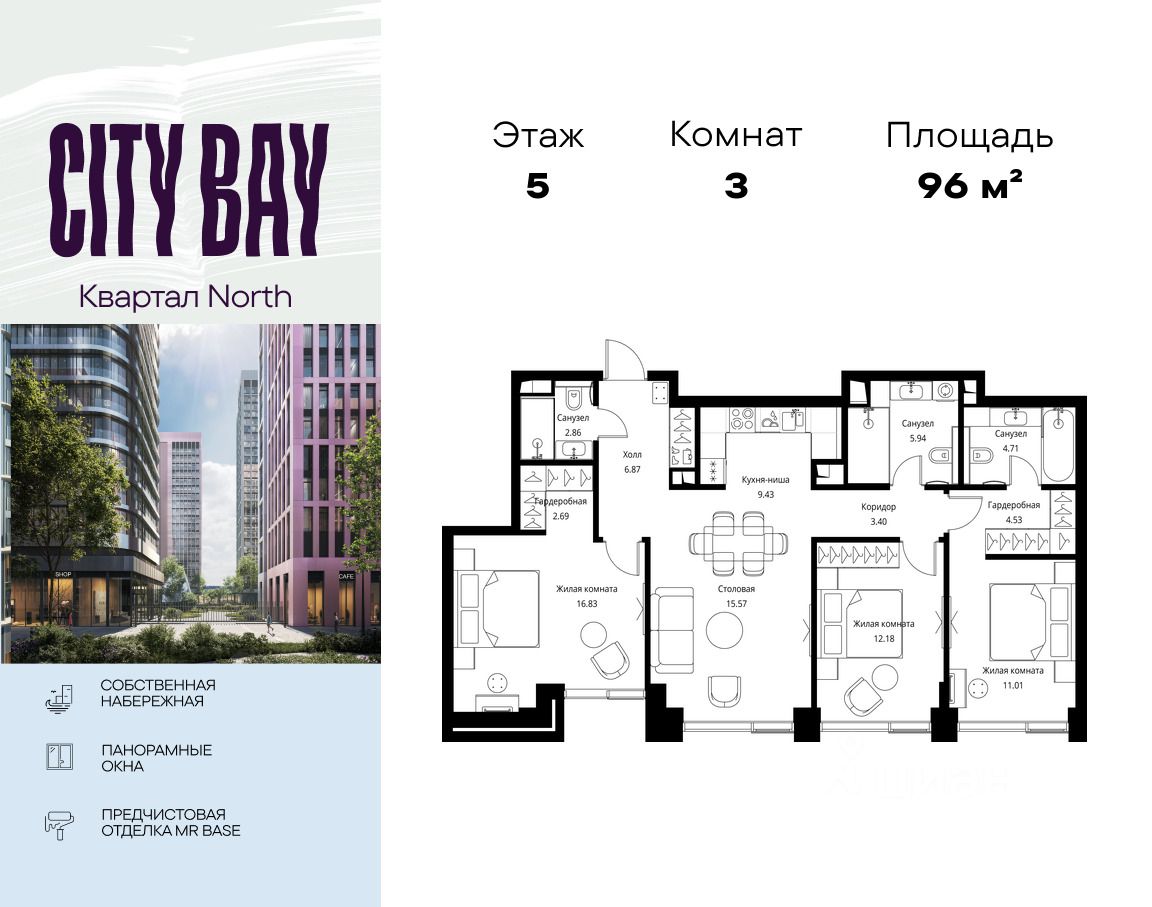 Продаётся 3-комнатная квартира общей площадью 96.02 м² с предчистовой отделкой в ЖК Сити Бэй, квартале North, на 5-м этаже 27 этажного дома.