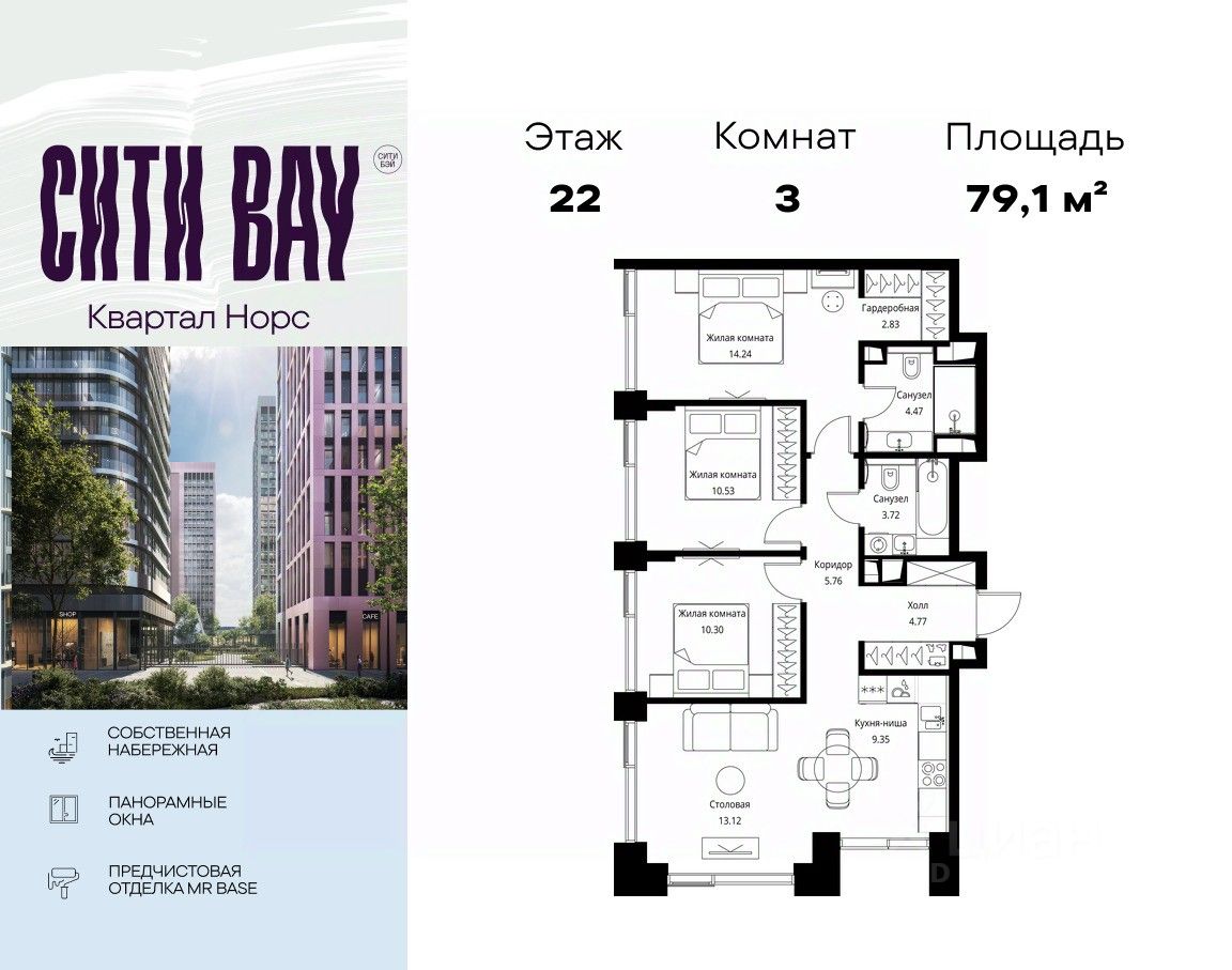 Продаётся 3-комнатная квартира общей площадью 79.09 м² с предчистовой отделкой в ЖК Сити Бэй, квартале Норс, на 22-м этаже 26 этажного дома.