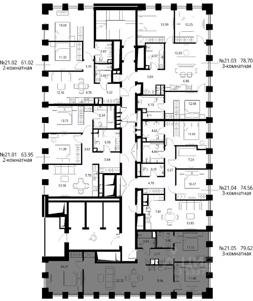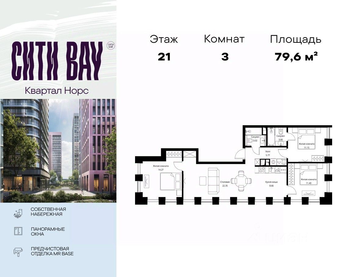 Продаётся 3-комнатная квартира общей площадью 79.62 м² с предчистовой отделкой в ЖК Сити Бэй, квартале Норс, на 21-м этаже 27 этажного дома.