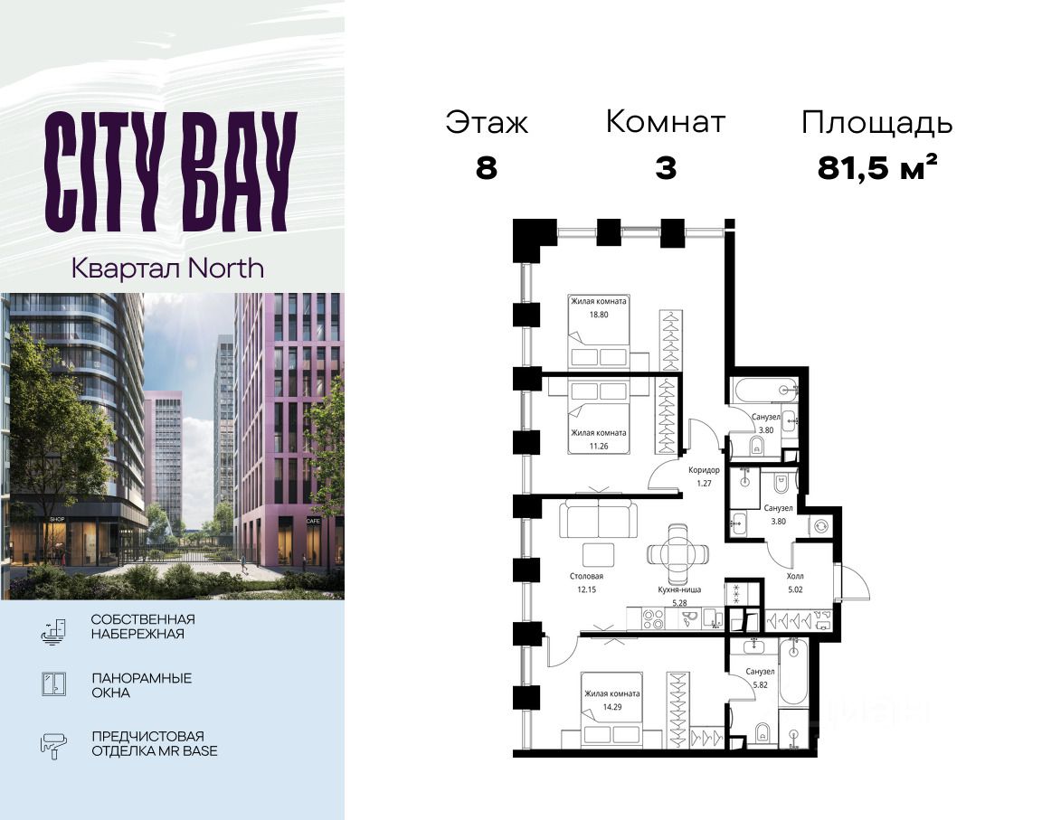 Продаётся 3-комнатная квартира общей площадью 81.49 м² с предчистовой отделкой в ЖК City Вау, квартале North, на 8-м этаже 27 этажного дома.
