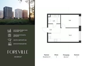 Предчистовая отделка в подарок! Пешая доступность от метро и московская прописка! Продается уютная 1-комн. квартира площадью 33,4 кв.м на 1 этаже 17 этажного жилого комплекса бизнес-класса Foreville от 3S Group.