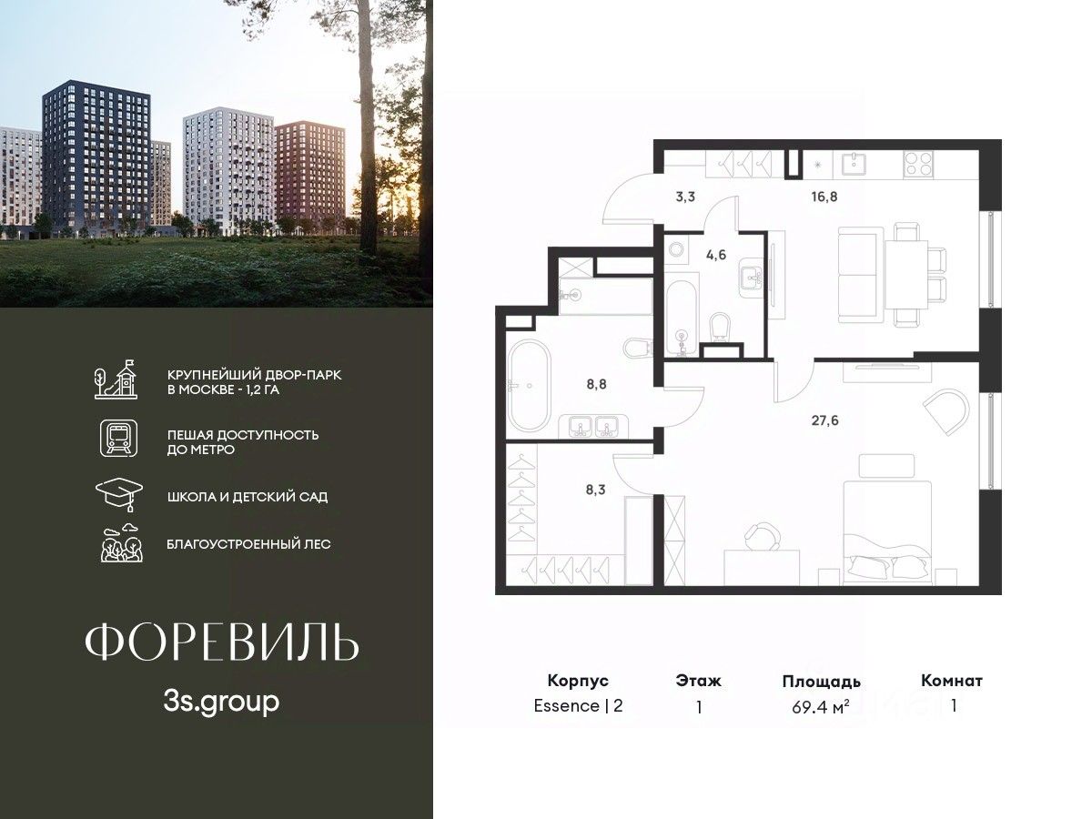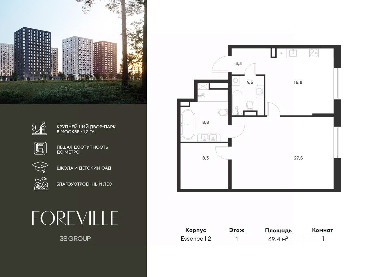 Предчистовая отделка в подарок! Пешая доступность от метро и московская прописка! Продается уютная 1-комн. квартира площадью 69,4 кв.м на 1 этаже 17 этажного жилого комплекса бизнес-класса Foreville от 3S Group.