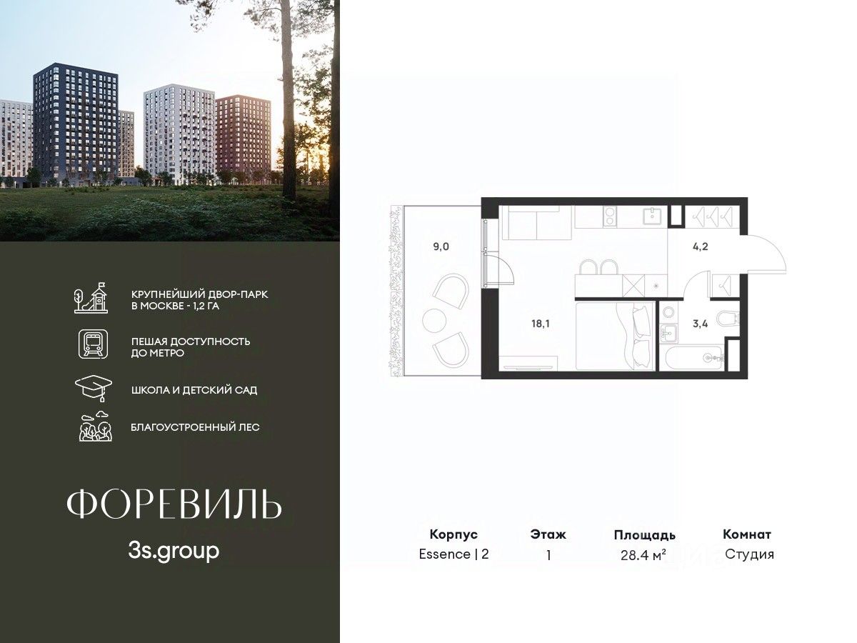 Предчистовая отделка в подарок! Пешая доступность от метро и московская прописка! Продается уютная студия площадью 28,4 кв.м на 1 этаже 17 этажного жилого комплекса бизнес-класса Foreville от 3S Group.