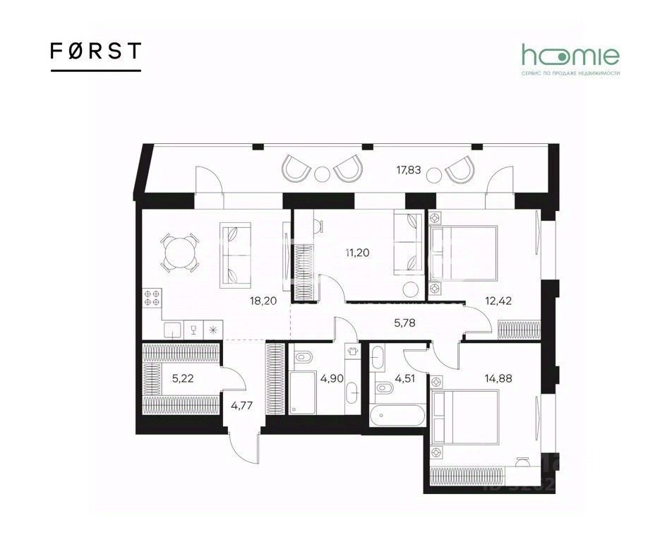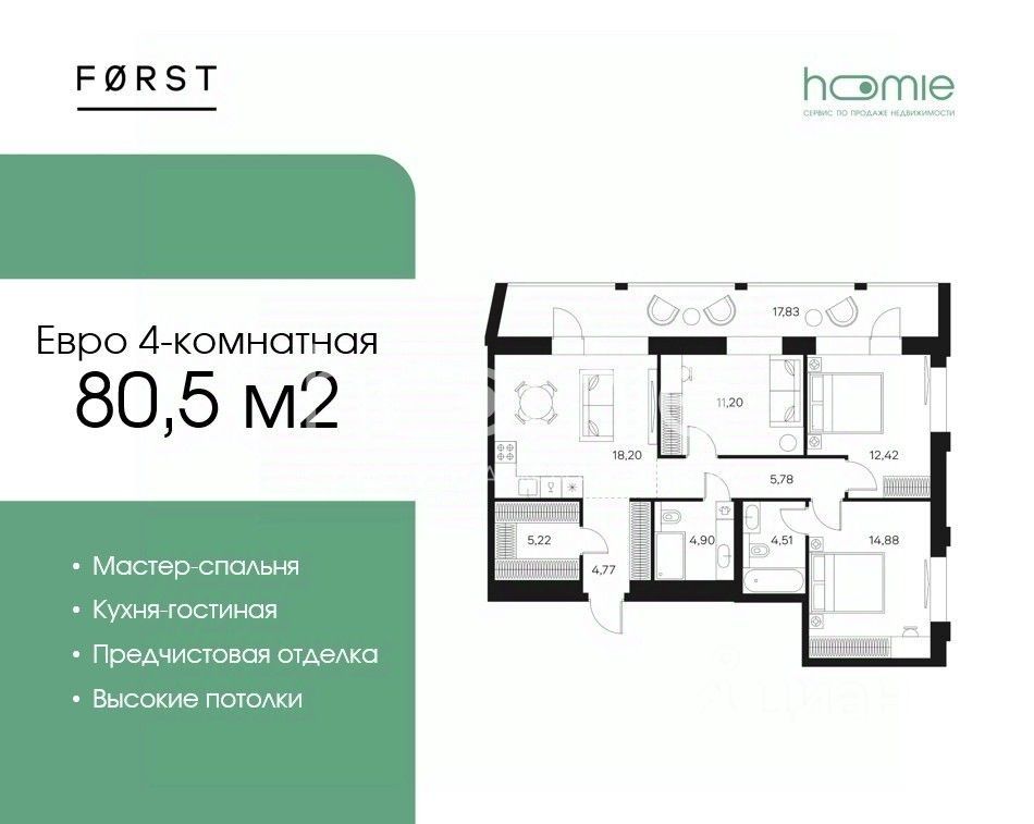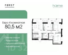 Евро-четырехкомнатная квартира с предчистовой отделкой в ЖК "FORST" на 9 этаже. Общая площадь: 80,5 кв.м., жилая: 38.5 кв.м., площадь просторной кухни-столовой: 18.2 кв.м. Угловая квартира, идеально подойдет любителям тишины и панорамных видов. В квартире два совмещенных санузла. Наличие в квартире террасы размером 17.83 кв.м. дает возможность для обустройства дополнительной площади. Высота потолков 2.85 м.