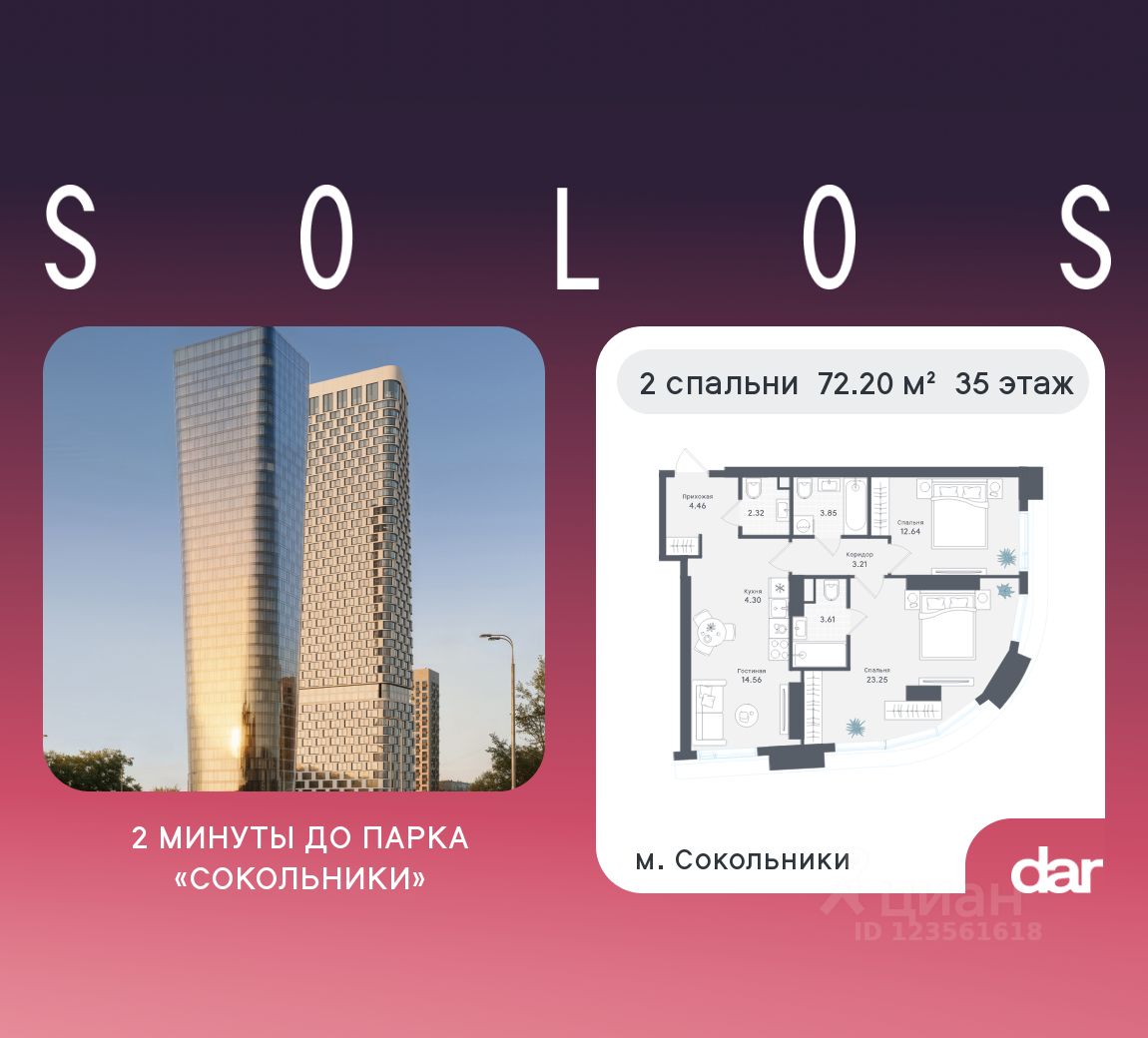 Продаётся 2-комнатная квартира 72.20 м² в жилом комплексе SOLOS (бизнес-класс) рядом с парком Сокольники. Квартиру отличают панорамное остекление, потолки 3.2 м, улучшенная шумо и воздухоизоляция. Дом сдаётся в 4 квартале 2029 года, продажи проходят через эскроусчета. Подземный паркинг, коворкинг, закрытая благоустроенная территория с фонтаном и артобъектами. Гибкие условия покупки.