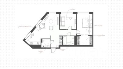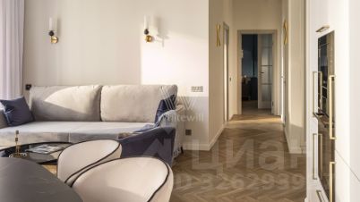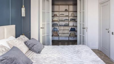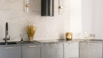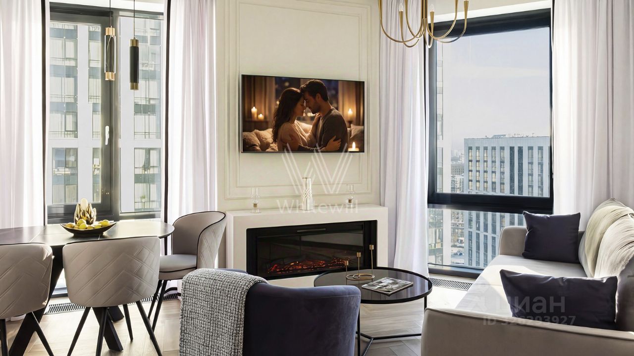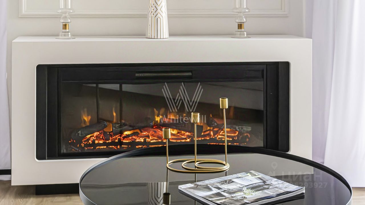 Главным акцентом кухни-гостиной является электрический камин. Эффектные светильники добавляют минималистичным интерьерам особого шарма. Планировка включает гостиную с кухонной зоной, мастер-спальню со своей гардеробной, вторую спальню, два санузла и холл.