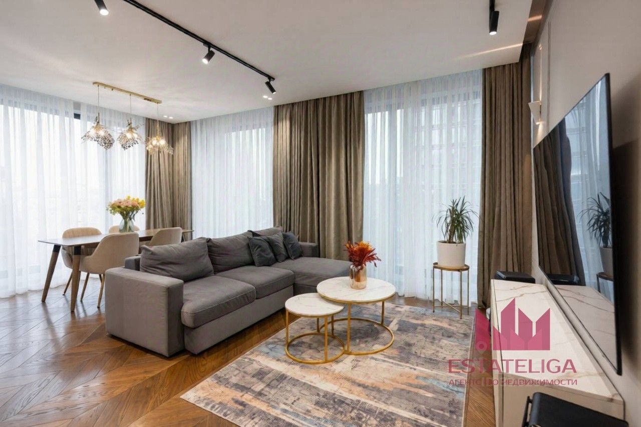 Функциональная планировка квартиры: просторная гостиная с большими панорамными окнами, плавно переходящее в функциональную кухню, пространство для отдыха, гардеробная, постирочная, холл.