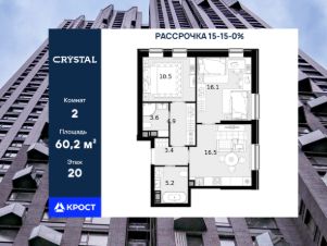 Однокомнатная квартира площадью 60,2 кв.м. на 20 этаже дома бизнес-класса "CRYSTAL Трилогия".