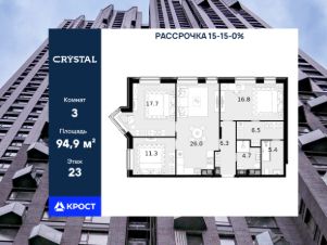 Однокомнатная квартира площадью 94,9 кв.м. на 23 этаже дома бизнес-класса "CRYSTAL Трилогия".