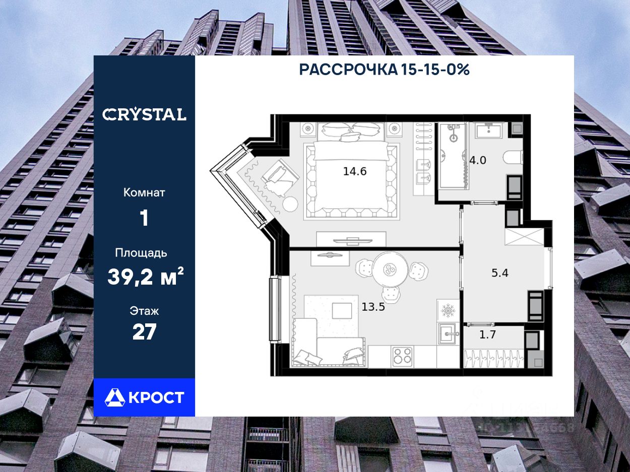 Однокомнатная квартира площадью 39,2 кв.м. на 27 этаже дома бизнес-класса "CRYSTAL Трилогия".