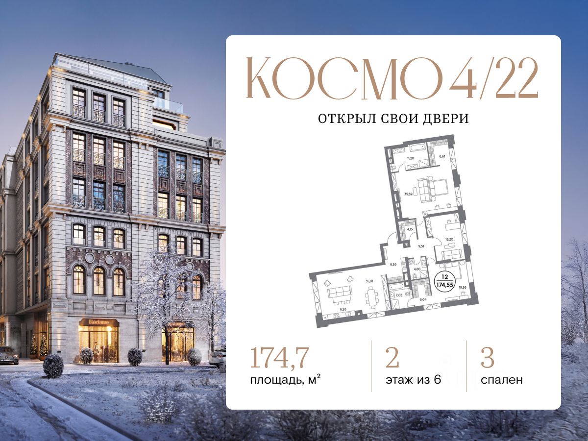 В клубном доме класса De Luxe "Космо 4/22", расположенном на острове Балчуг, напрямую от девелопера ГК "Галс-Девелопмент" представлена 3-комнатная квартира на 2 этаже общей площадью 174.70 м².