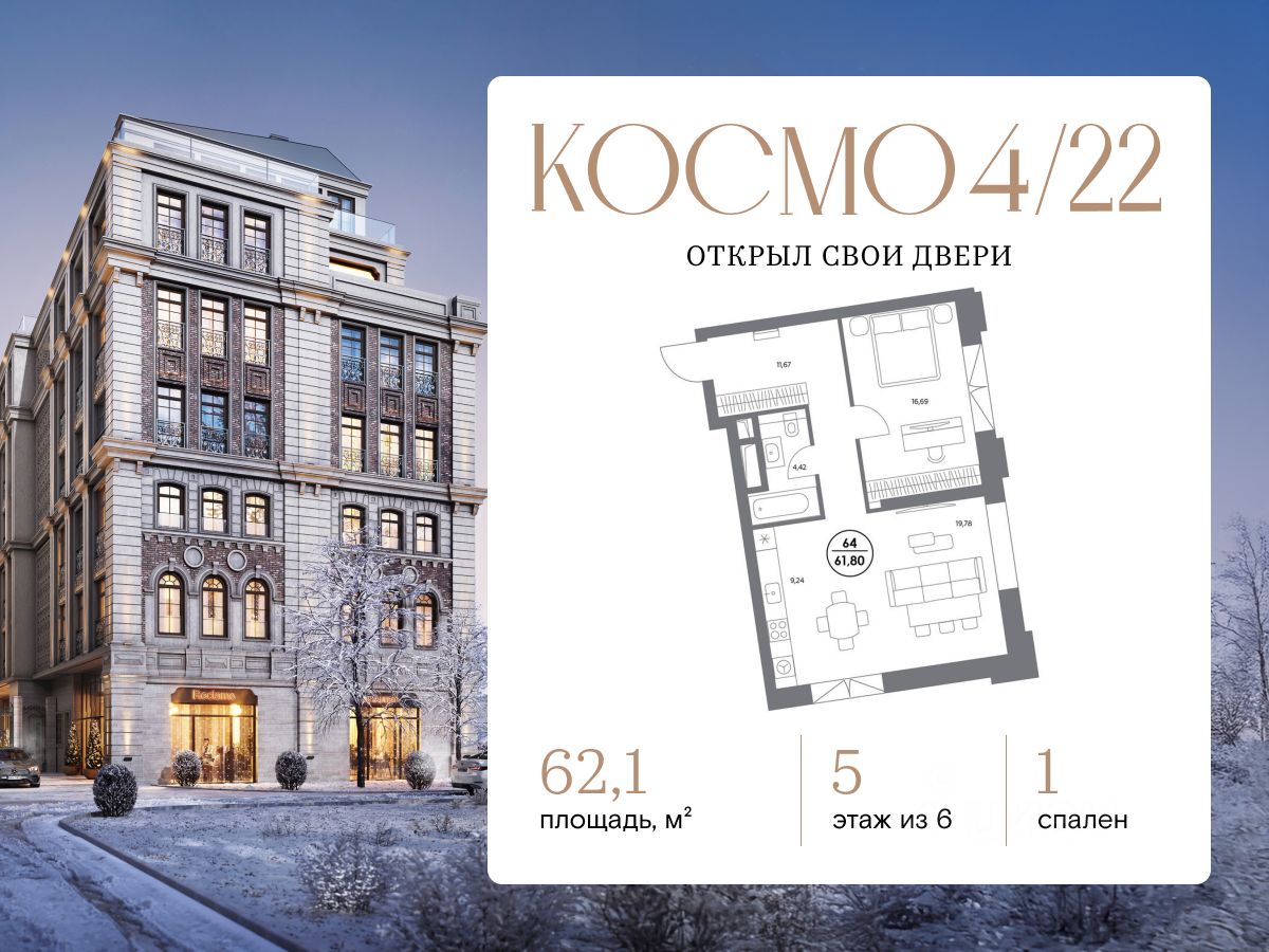 В клубном доме класса De Luxe "Космо 4/22", расположенном на острове Балчуг, напрямую от девелопера ГК "Галс-Девелопмент" представлена 1-комнатная квартира на 5 этаже общей площадью 62.10 м².