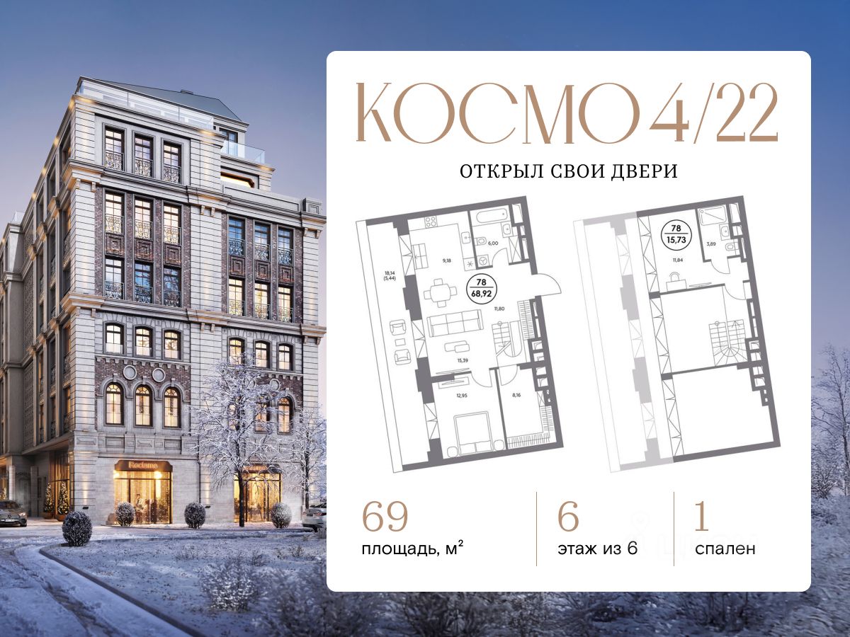 В клубном доме класса De Luxe "Космо 4/22", расположенном на острове Балчуг, напрямую от девелопера ГК "Галс-Девелопмент" представлена 1-комнатная квартира на 6 этаже общей площадью 69.00 м².