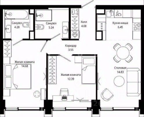 Удачная функциональная планировка. Тип отделки MR Base (Предчистовая).