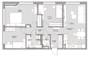4-комнатная квартира с прекрасным видом на Москва-Сити. Расположена на 15 этаже 20-этажного монолитно-кирпичного дома, построенного в 2021 году. Общая площадь квартиры составляет 80.1 кв. м, с просторной кухней-гостинной площадью 22.75 кв. м. и тремя изолированными комнатами, двумя санузлами с душем и ванной. Высота потолков — 2.85 метра. Планировка позволяет максимально эффективно использовать пространство для жизни и работы большой семьи.