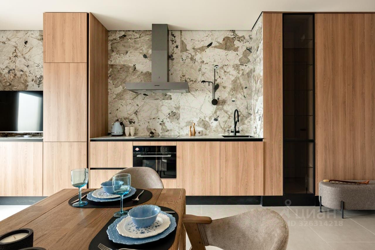 Планировка включает светлую кухню-гостиную, спальню и комнату свободного назначения (оборудуется по необходимости), гардеробную, постирочную комнату, 2 санузла. Пространство дополняют: