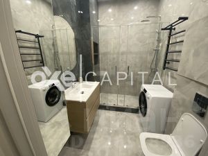 Ванная комната отделана плиткой из керамогранита. Установлены французские гарнитуры Jacob Delafon и немецкая сантехника Grohe. Душевая кабина оснащена тропическим душем с термостатом и раздвижными дверцами.