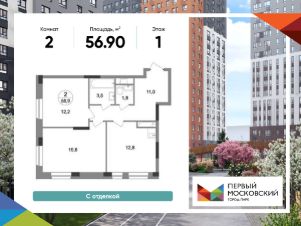 Общая площадь квартиры - 56,9 кв. м, этаж 1 из 19.