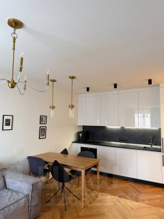 В квартире выполнен дизайнерский ремонт с использованием дорогих материалов. Установлена немецкая встроенная техника, испанская сантехника. Выполнена шумоизоляция.
