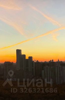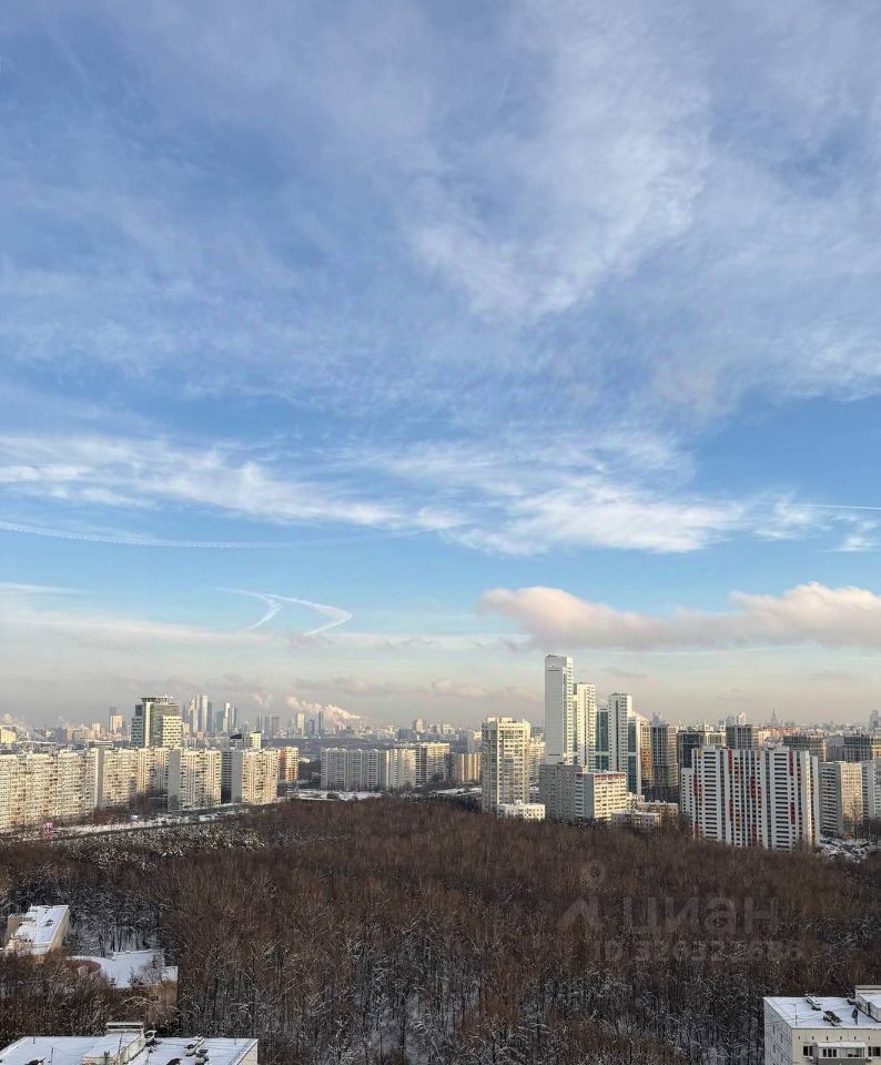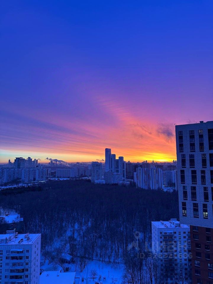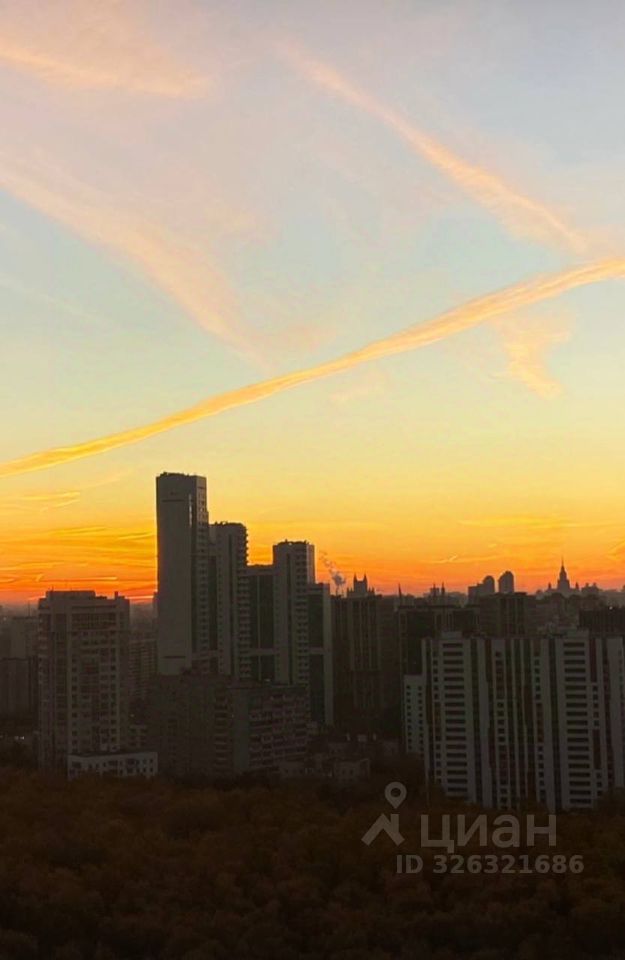 Панорамные окна с видом на рассвет: лес, Москва-Сити, МГУ, здание МИД.
