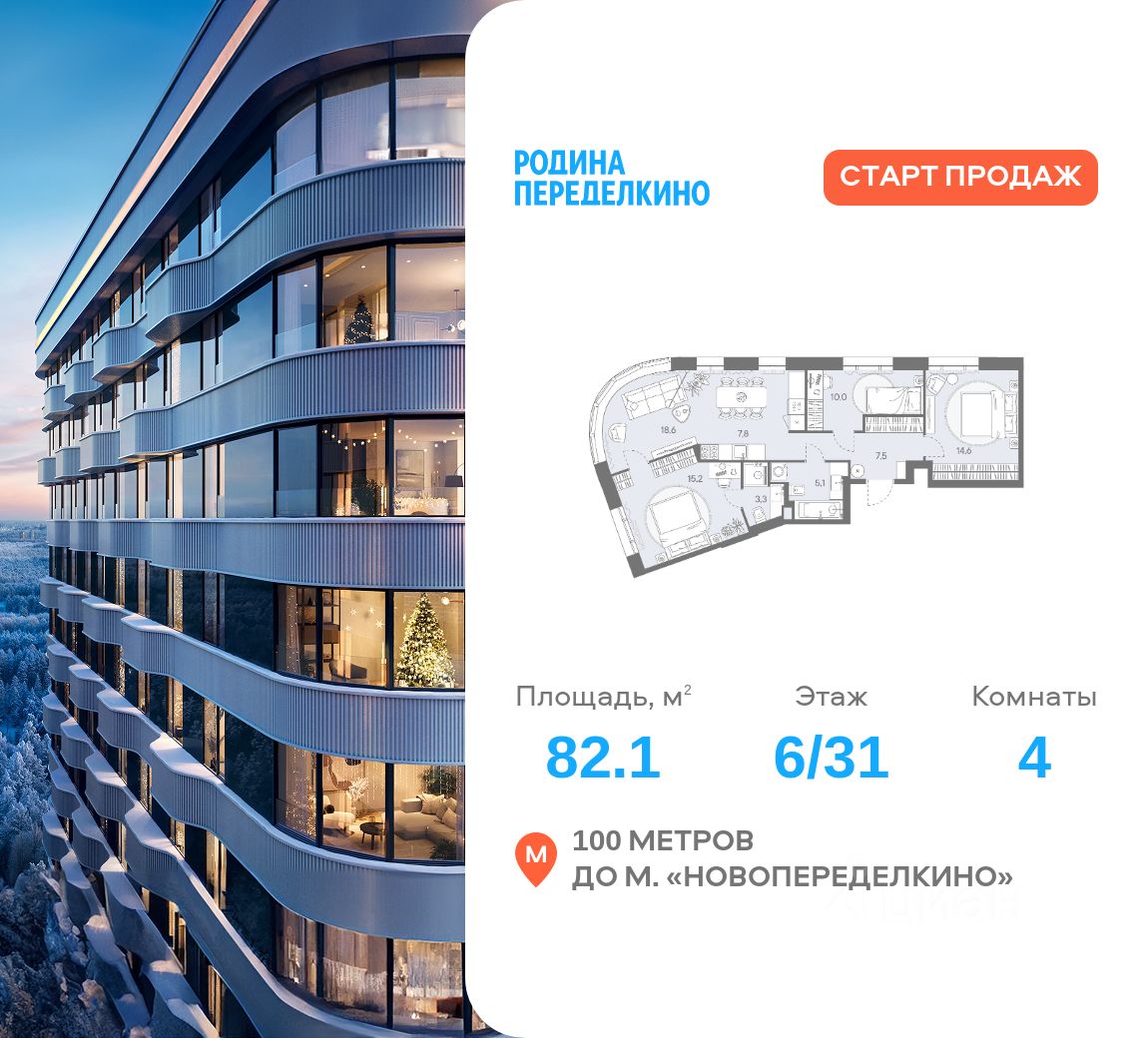 Продаётся 4-комнатная квартира площадью 82.1 м² на 6 этаже в Жилом Комплексе "Родина Переделкино".