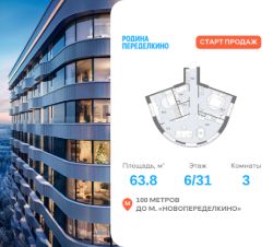 Продаётся 3-комнатная квартира площадью 63.8 м² на 6 этаже в Жилом Комплексе "Родина Переделкино".