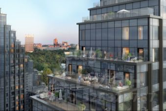 Внутри комплекса есть приватный двор с оригинальным ландшафтным дизайном, а также просторное лобби с потолками высотой до 10 метров, лаунж-зоной, мягкими диванами и огромным камином. Для резидентов будет доступна своя клубная инфраструктура: студии йоги и сайкла, тренажерный зал, коворкинг, кинозал и детская игровая комната. В подземном паркинге предусмотрены автомойка, места для зарядки электромобилей, станция подкачки шин с пылесосом и усилитель сигнала связи. Также для удобства жителей предусмотрены колясочные и помещения для хранения велосипедов.