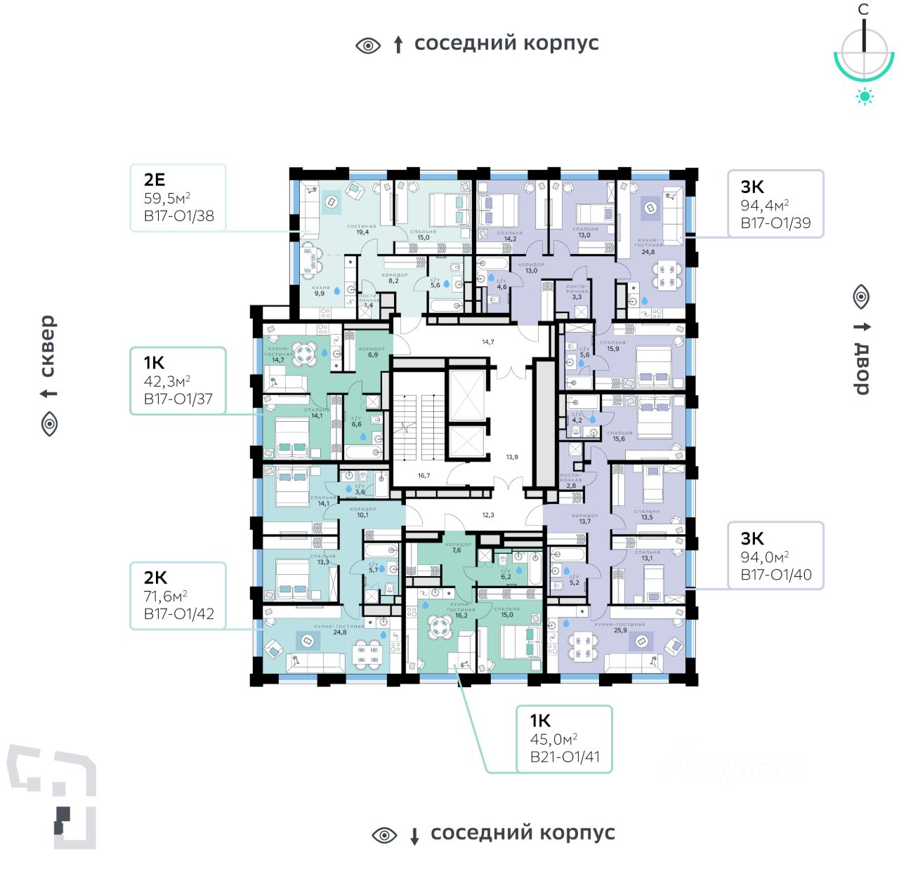 В продаже — однокомнатная квартира, общей площадью 59,5 кв. м. Квартира расположена на седьмом этаже десятиэтажного дома класса Оптимум в квартале В17 нового района СберСити, который строит Сбер. Всего в доме — 55 квартир.
