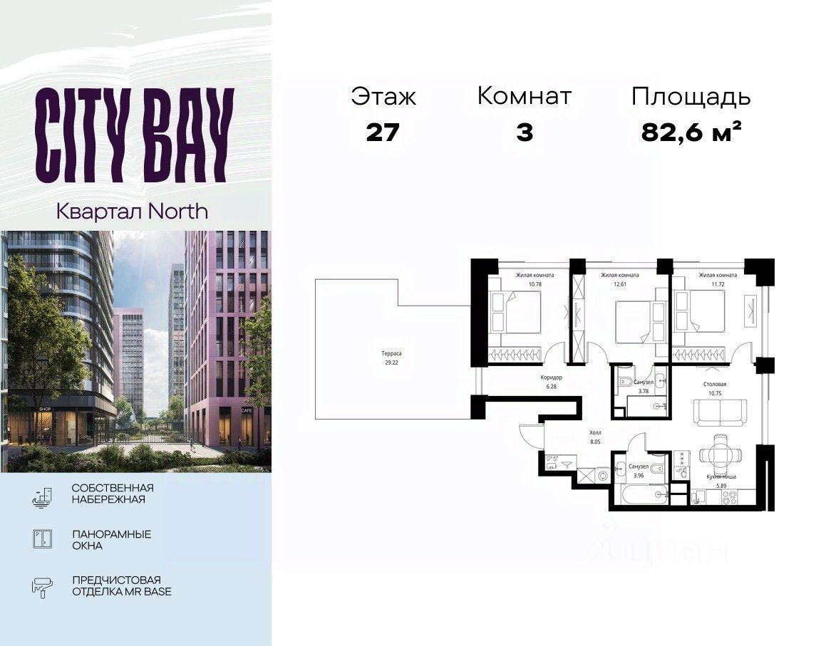 Продаётся 3-комнатная квартира общей площадью 82.59 м² с предчистовой отделкой в ЖК City Вау, квартале North, на 27-м этаже 27 этажного дома.