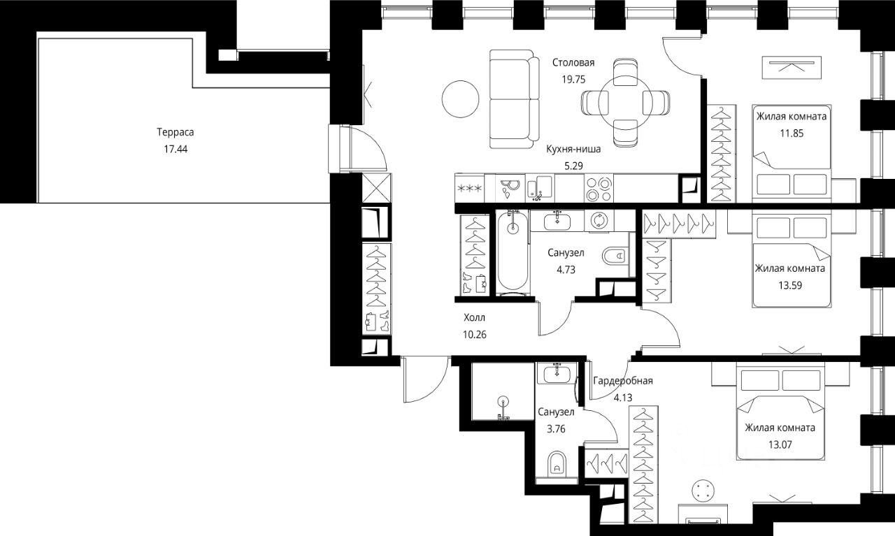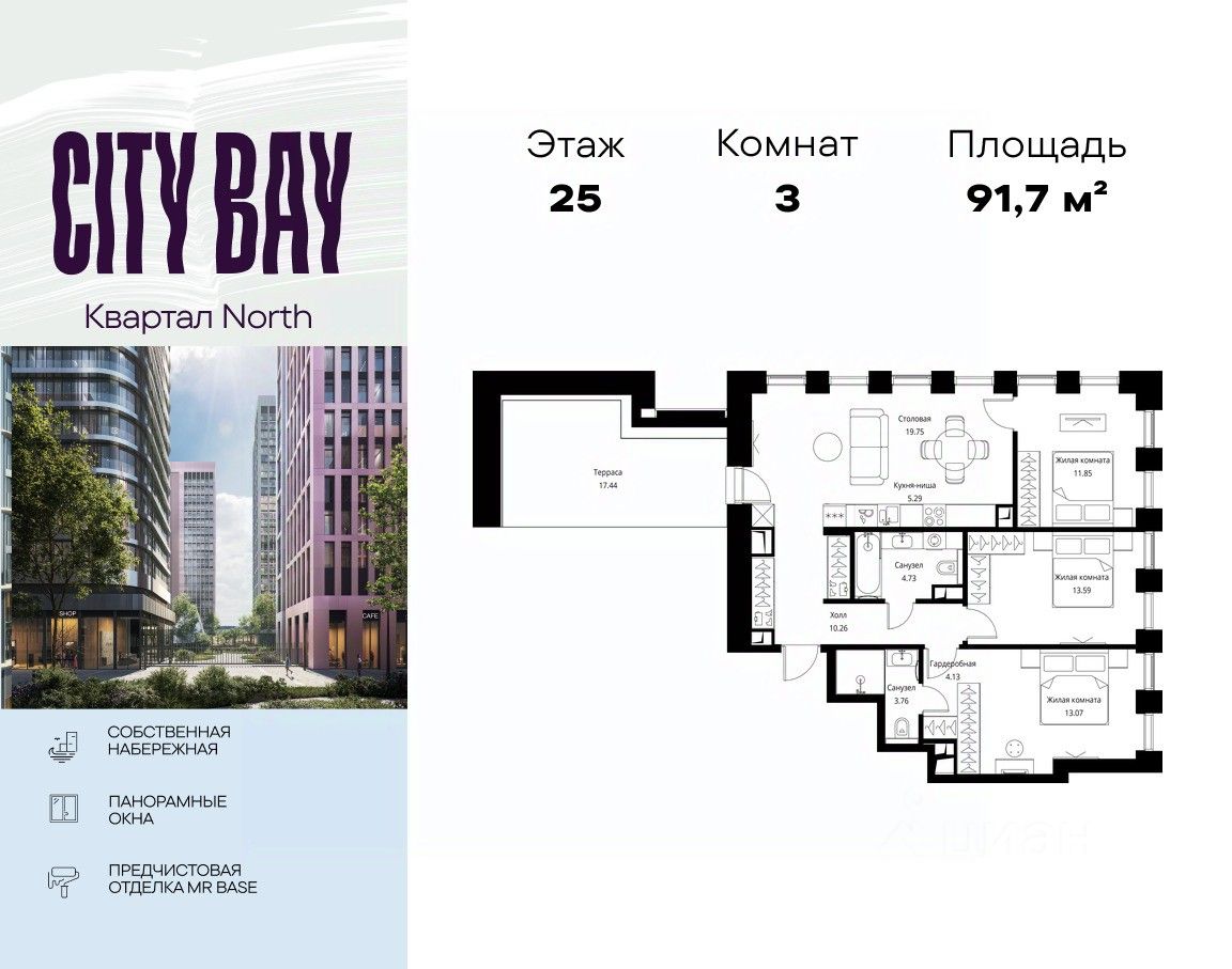 Продаётся 3-комнатная квартира общей площадью 91.66 м² с предчистовой отделкой в ЖК Сити Бэй, квартале North, на 25-м этаже 26 этажного дома.