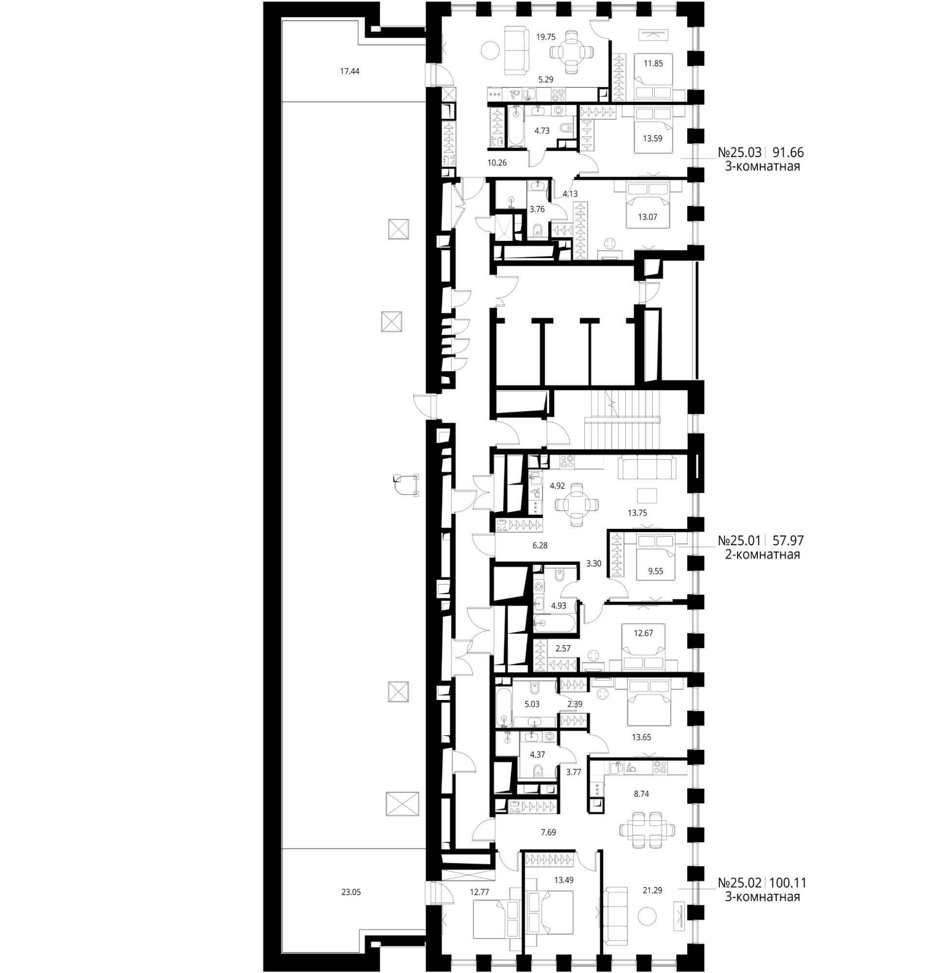 Продаётся 3-комнатная квартира общей площадью 91.66 м² с предчистовой отделкой в ЖК Сити Бэй, квартале Норс, на 25-м этаже 26 этажного дома.