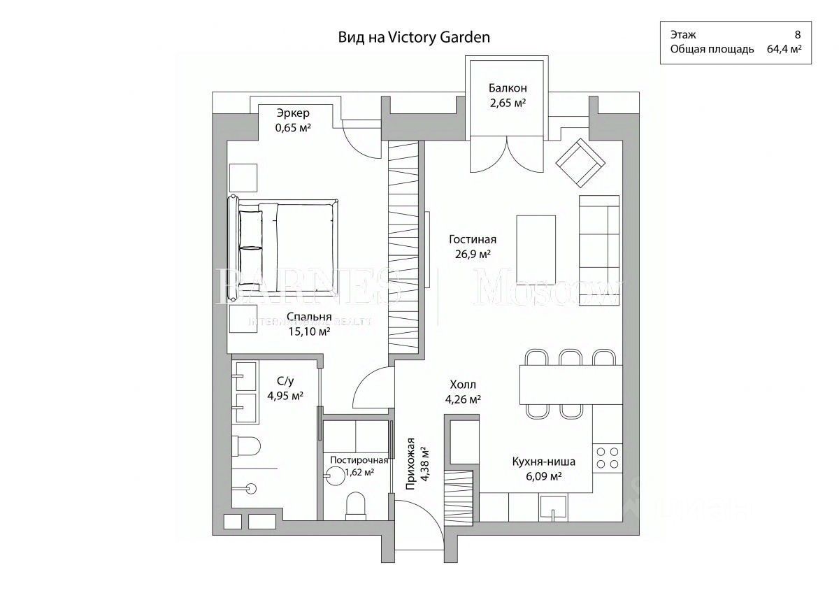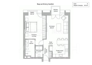 Планировка: просторная гостиная с зоной кухни и панорамным видом на приватный сад Victory Garden, спальня с собственной гардеробной и ванной комнатой, гостевой санузел с постирочной зоной, удобная прихожая с гардеробом.